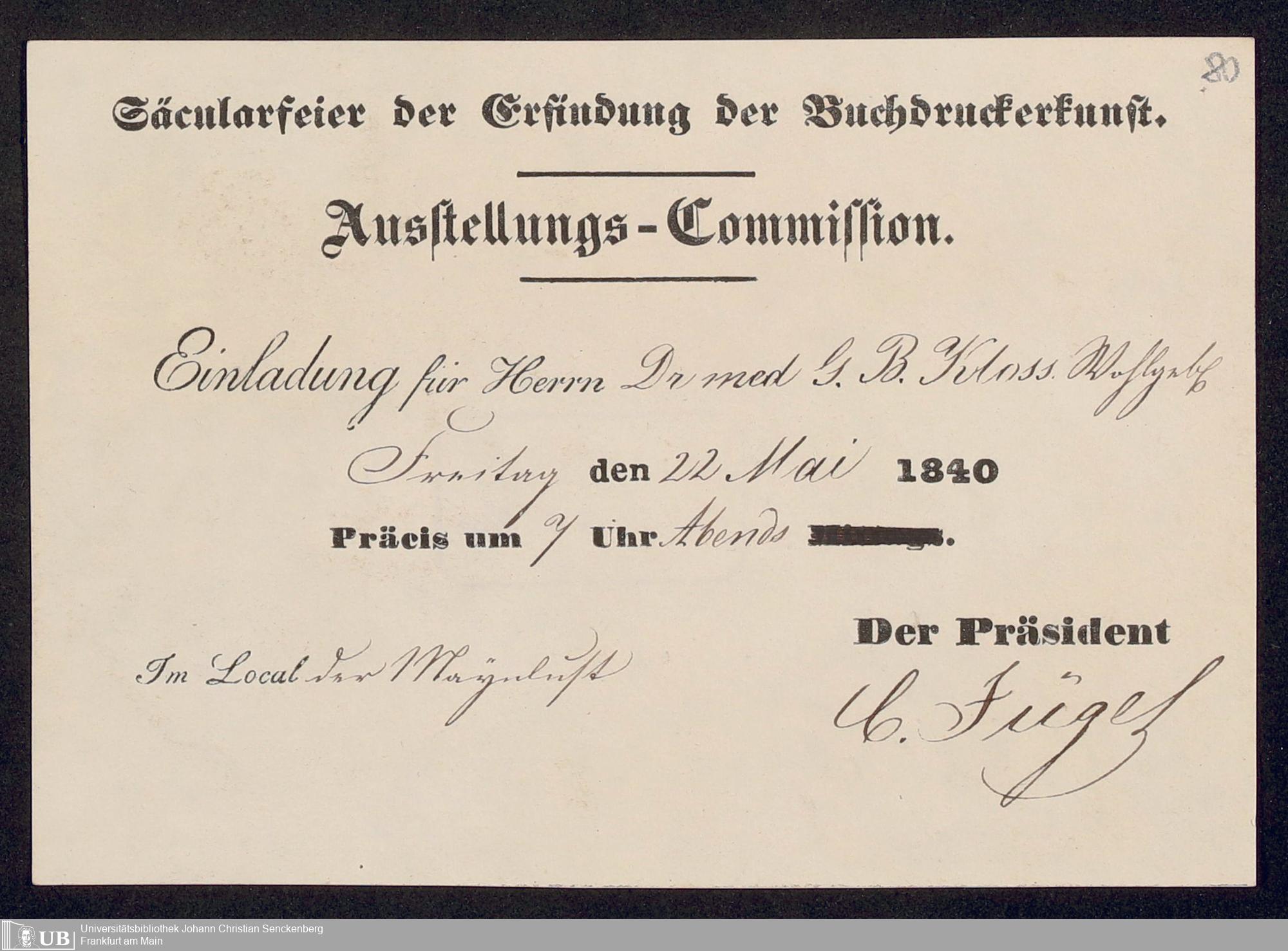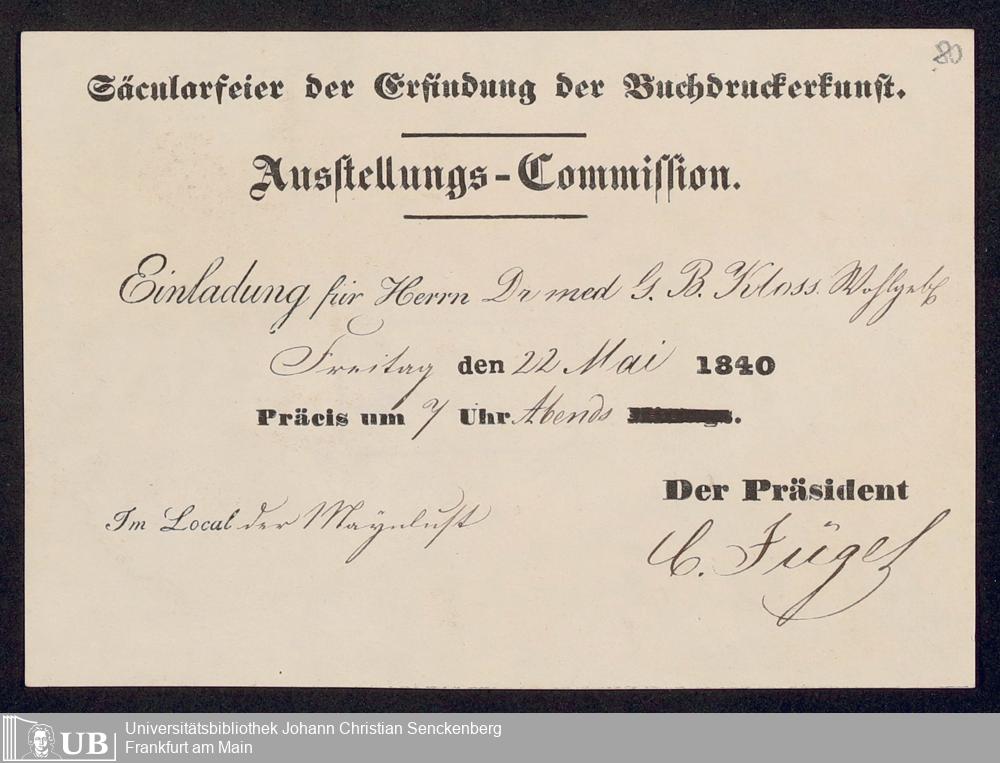 Ms. Ff. G. Kloß VI.6 - Drucksachen und weitere Unterlagen zur Säcularfeier der Erfindung der Buchdruckerkunst 1840