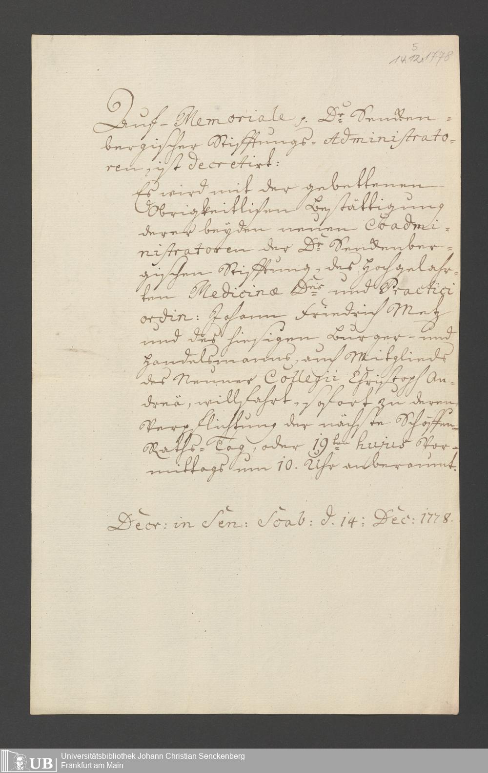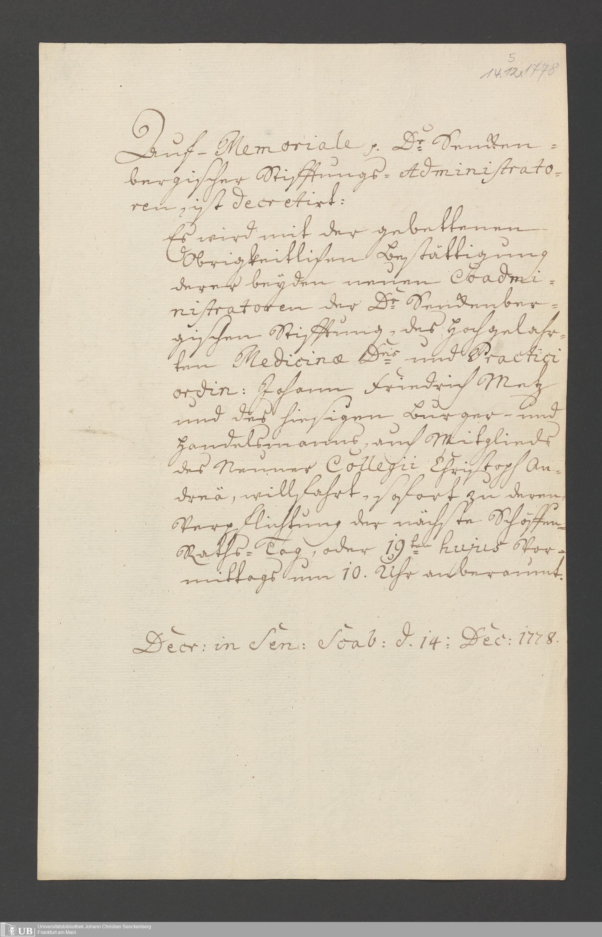 B 5 Dr. Senckenbergische Stiftung, 2 - Wahl, Bestätigung durch den Schöffenrat und Abdankung von Mitgliedern der Administration