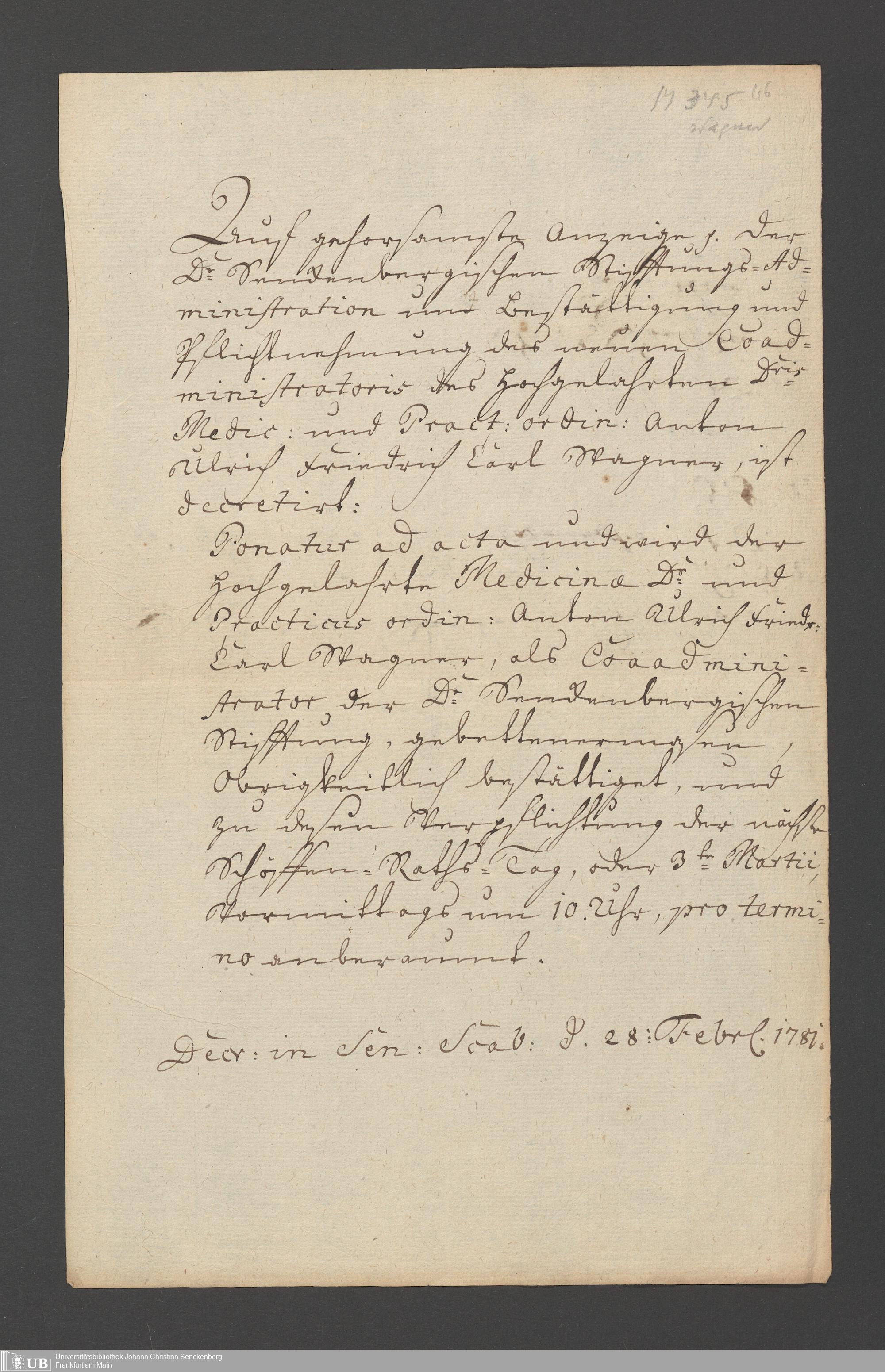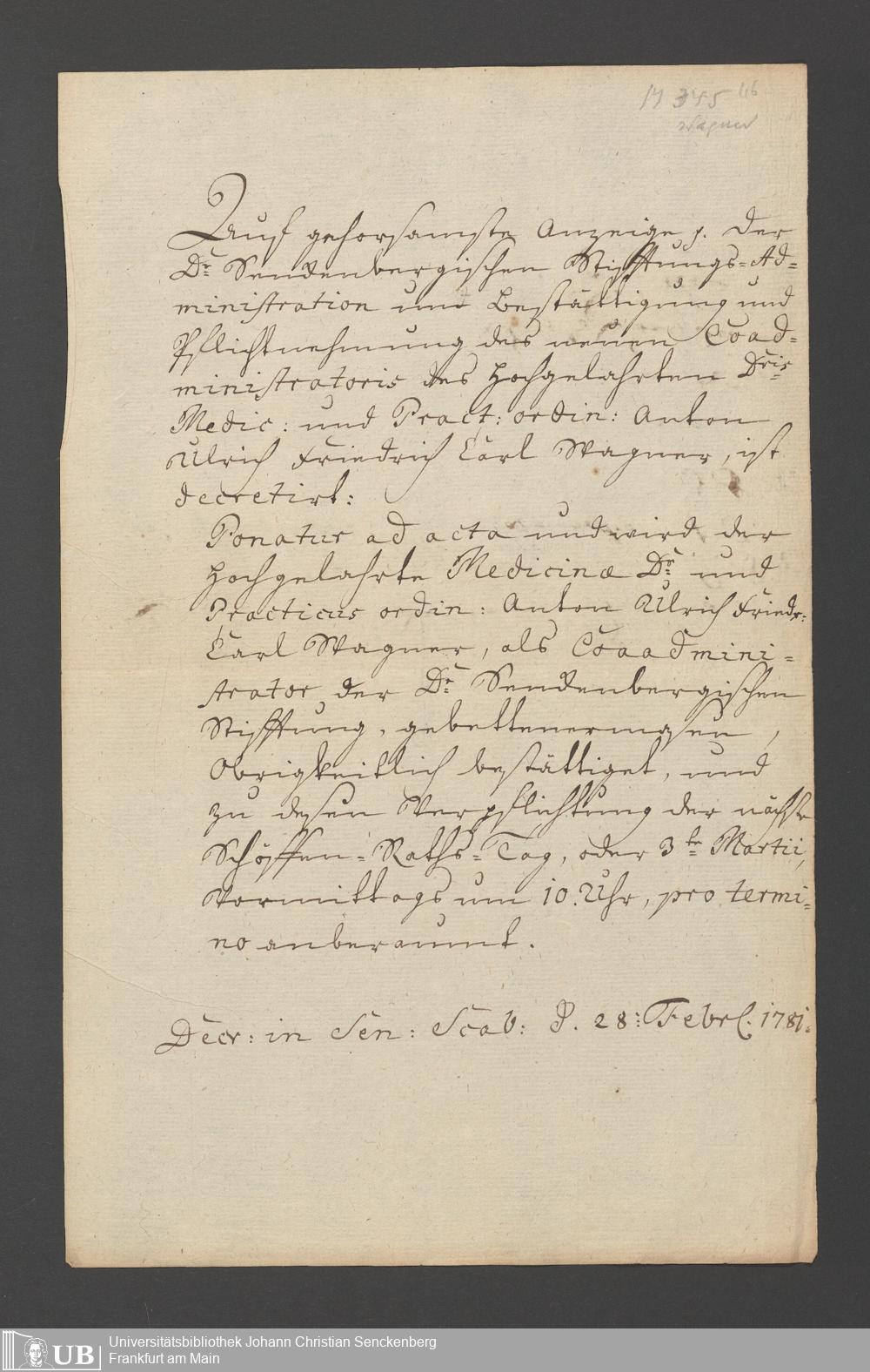 B 5 Dr. Senckenbergische Stiftung, 2 - Wahl, Bestätigung durch den Schöffenrat und Abdankung von Mitgliedern der Administration