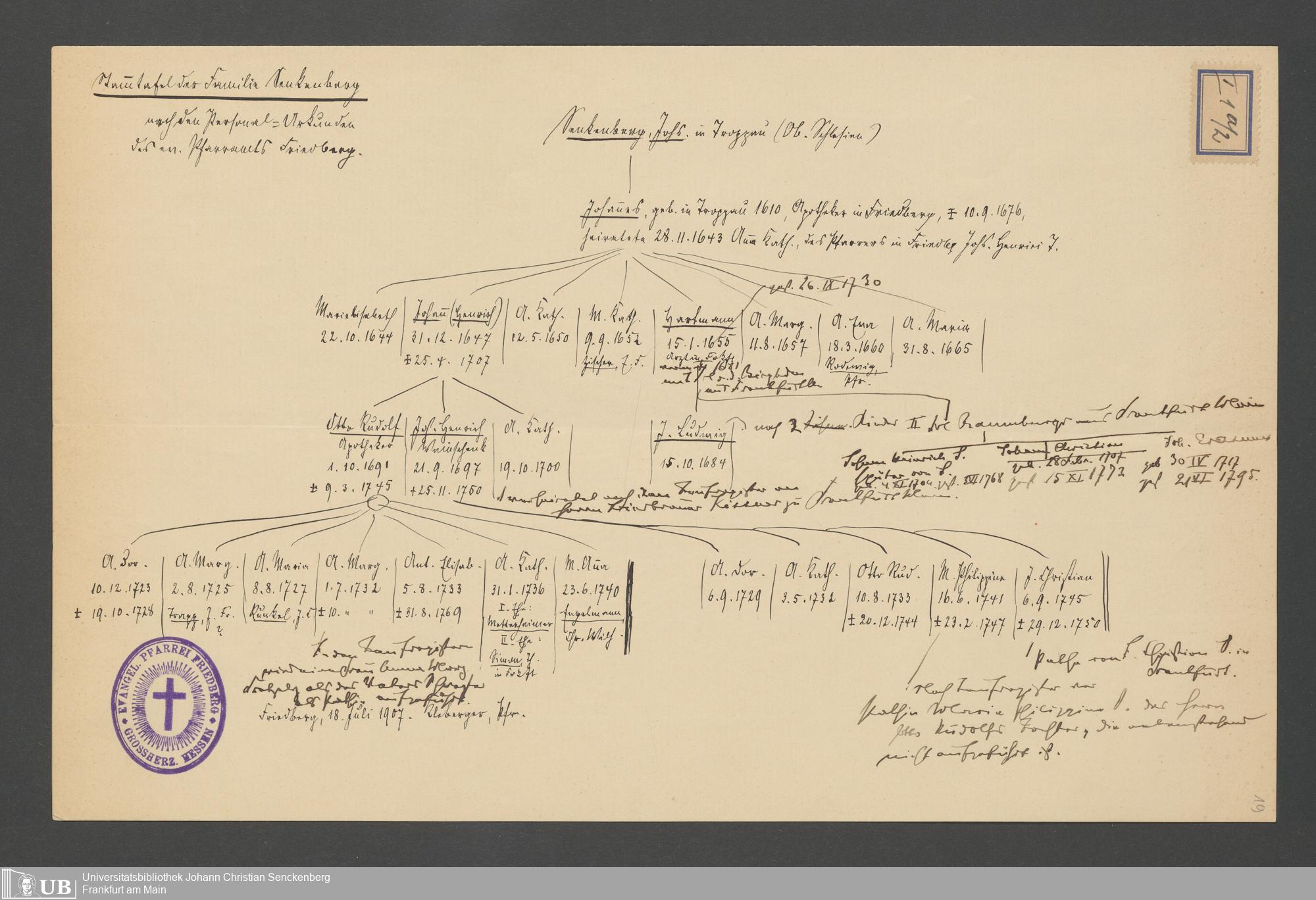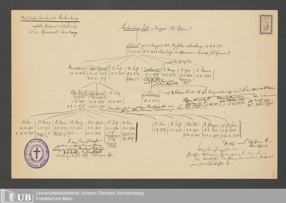 Na 31 Nachlass Johann Christian Senckenberg, 55 - Stammtafeln und Kirchenbuchauszüge zur Familie Senckenberg