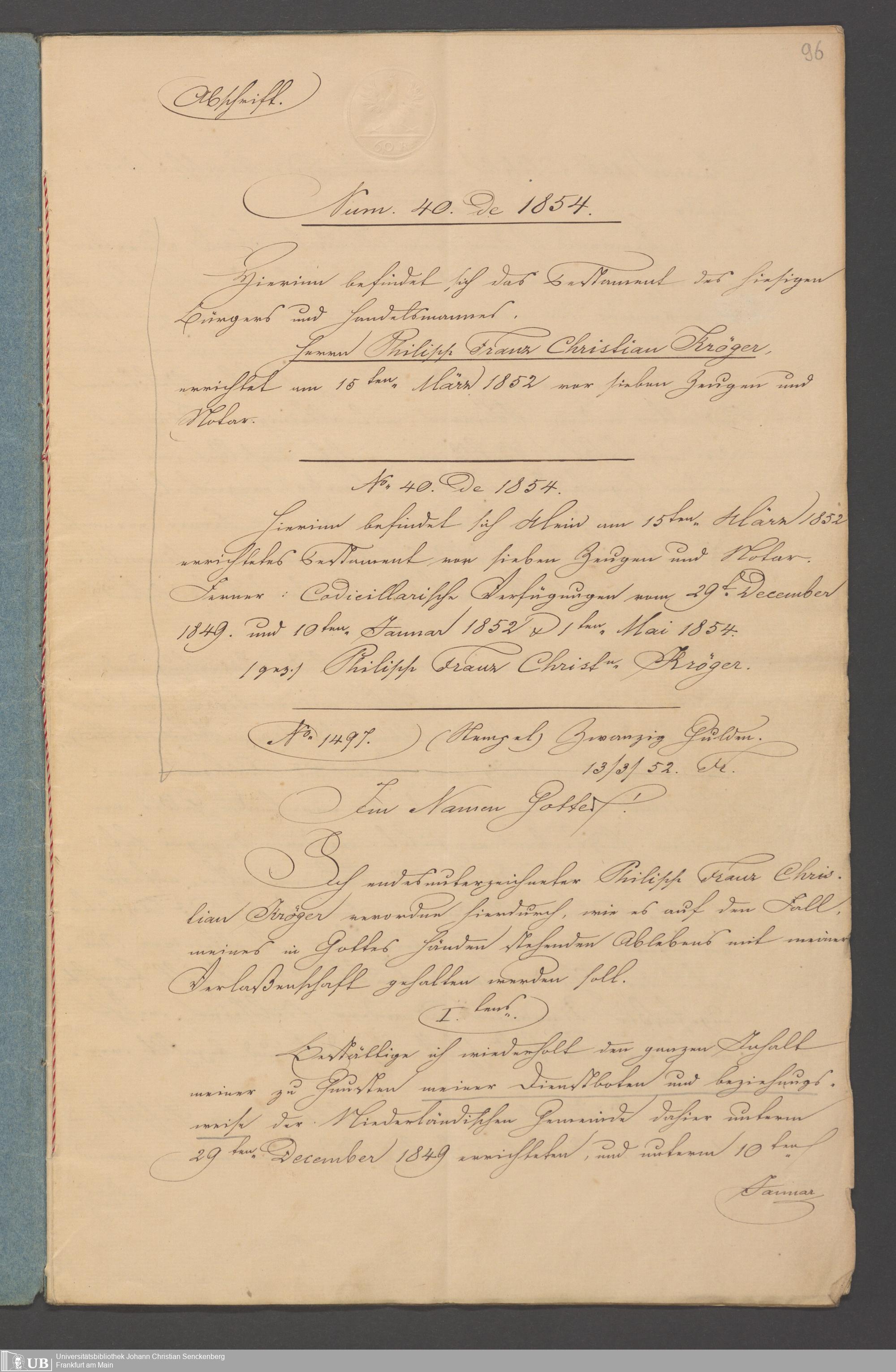 B 5 Dr. Senckenbergische Stiftung, 100 - Testament Philipp Franz Christian Kröger