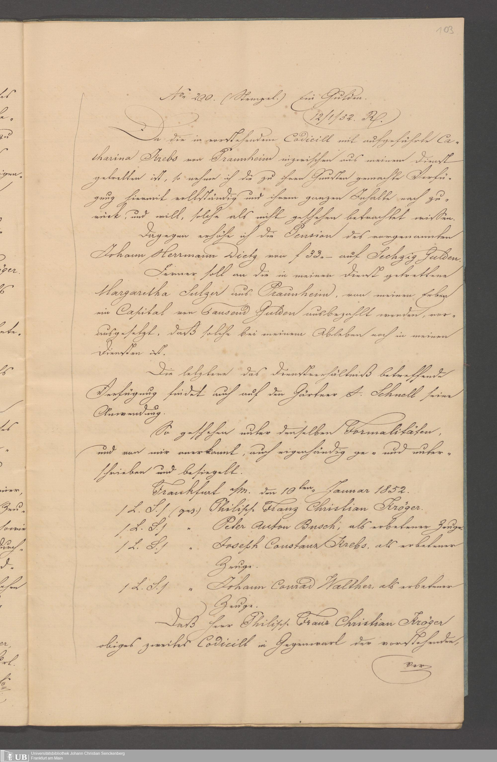 B 5 Dr. Senckenbergische Stiftung, 100 - Testament Philipp Franz Christian Kröger