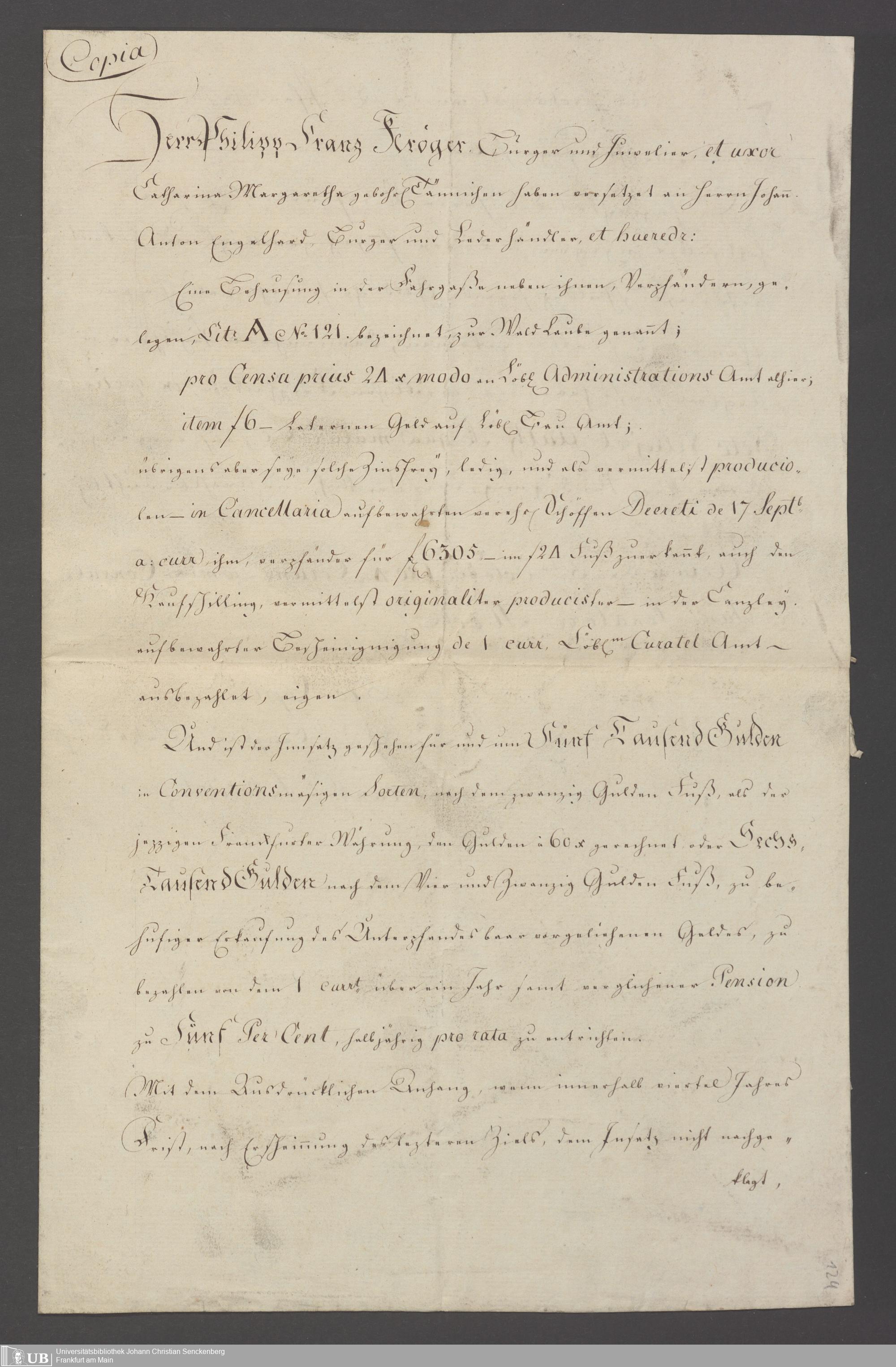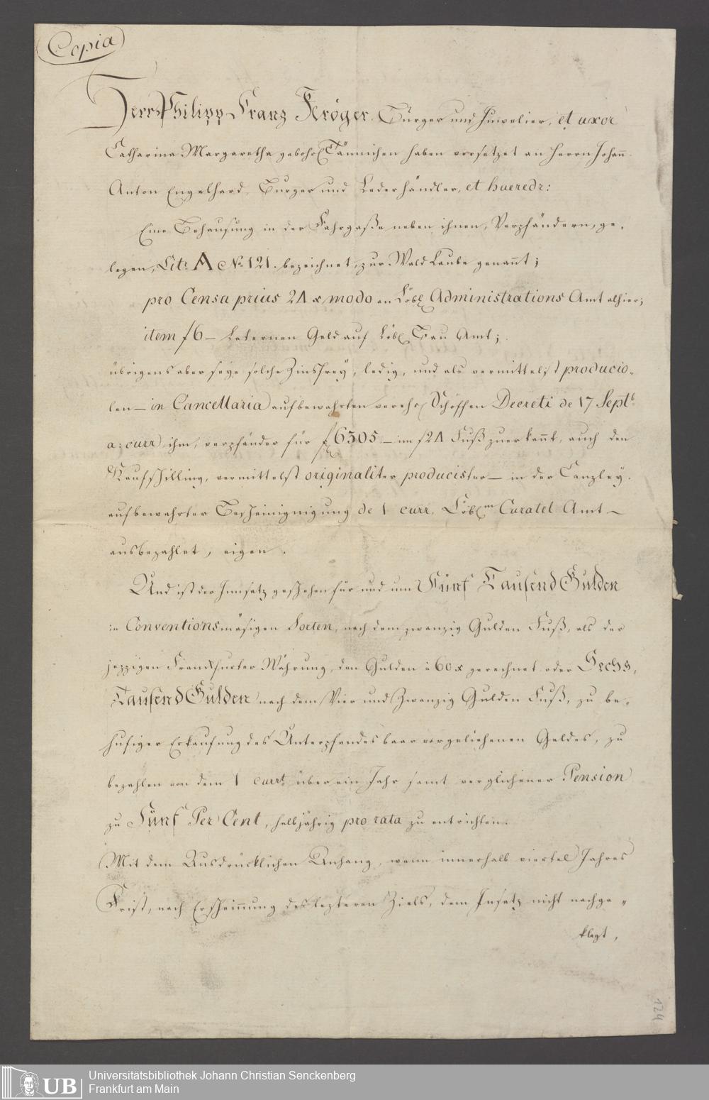 B 5 Dr. Senckenbergische Stiftung, 100 - Testament Philipp Franz Christian Kröger