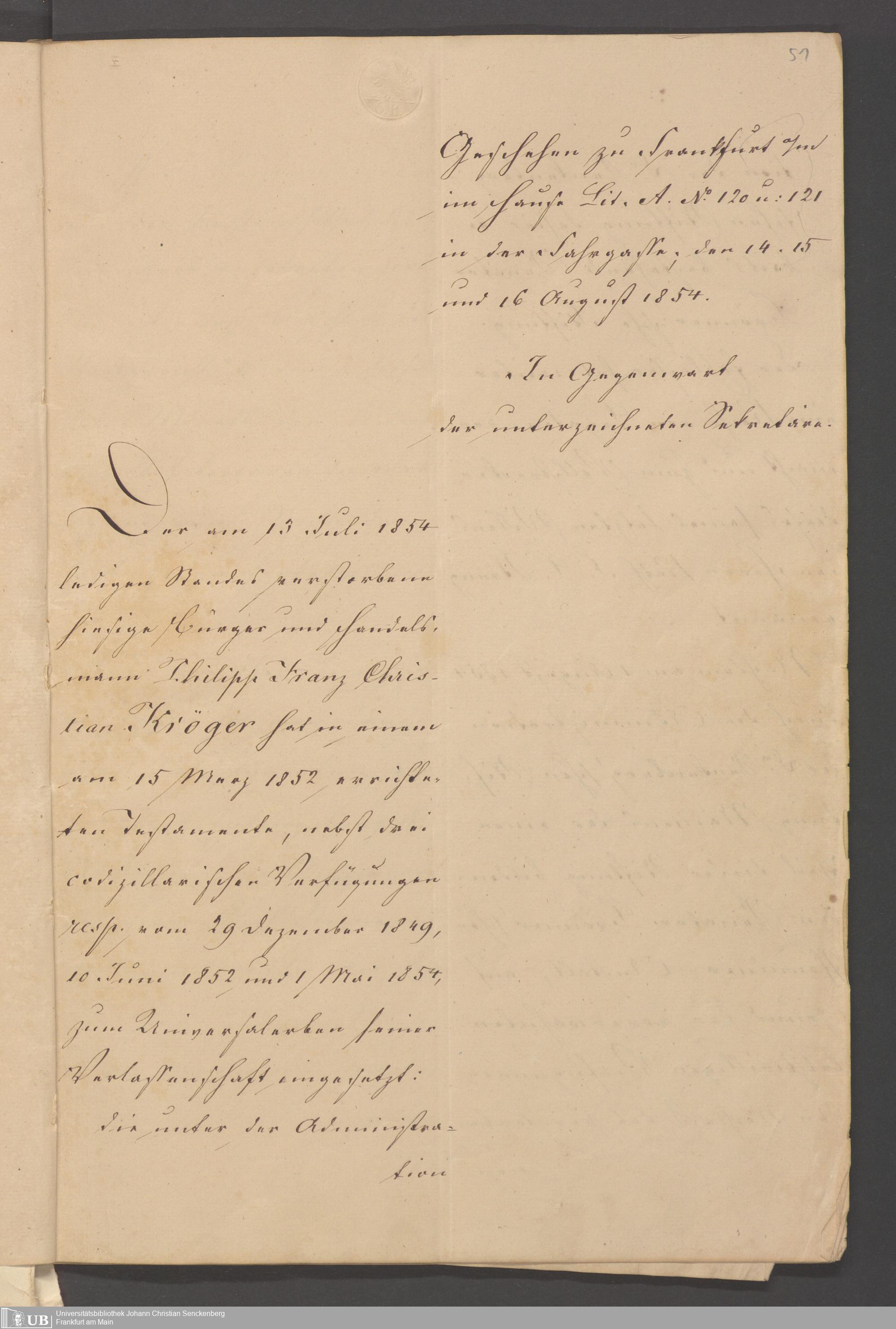 B 5 Dr. Senckenbergische Stiftung, 101 - zum Testament Kröger I