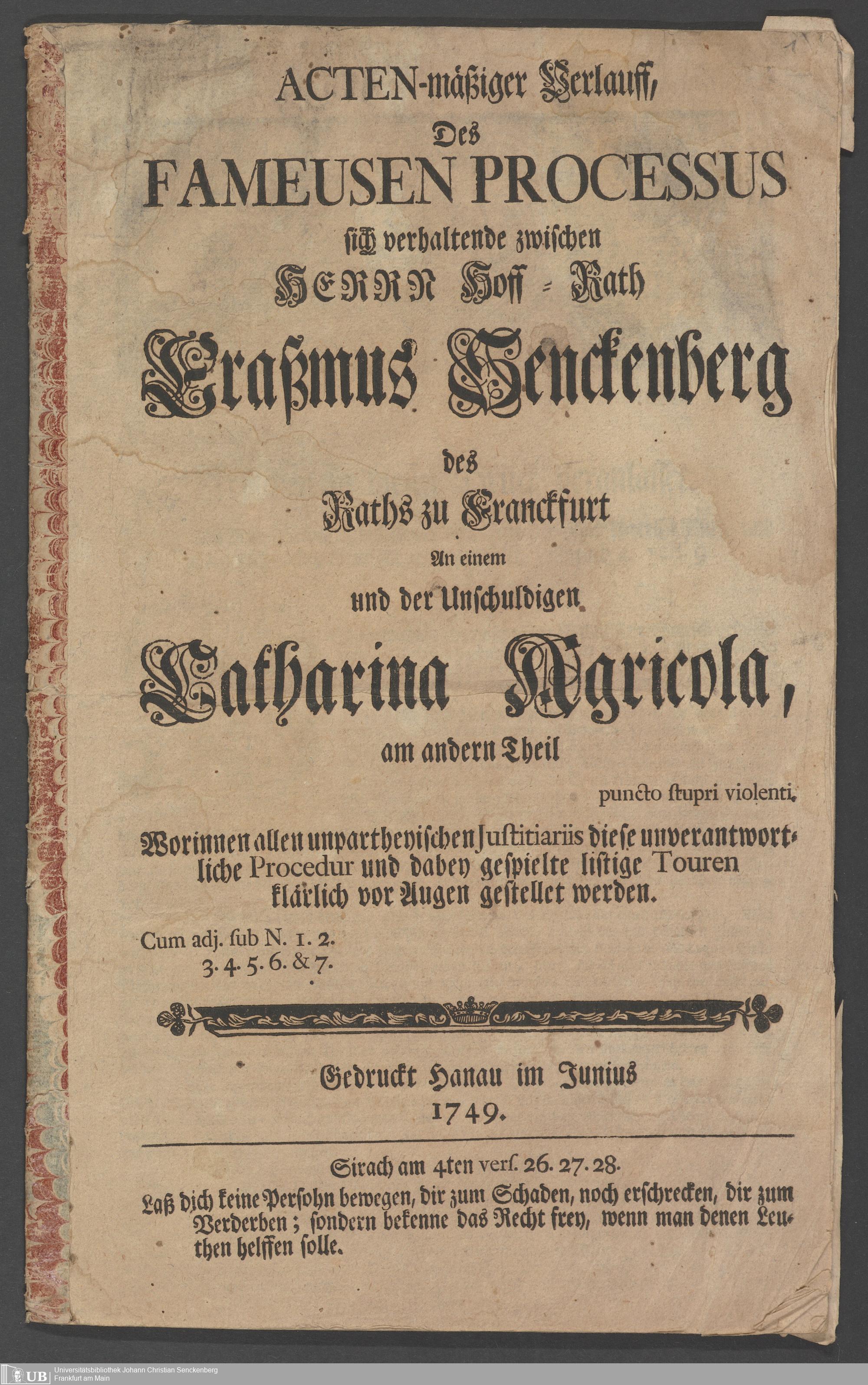 Na 31 Nachlass Johann Christian Senckenberg, 73 - Prozeßakten Agricola (Druck) 1749. Nürnberger Urteil gegen Erasmus Senckenberg (Druck) 1761. Vergleichsverhandlung mit dem Senat (p. I.1.b.20)