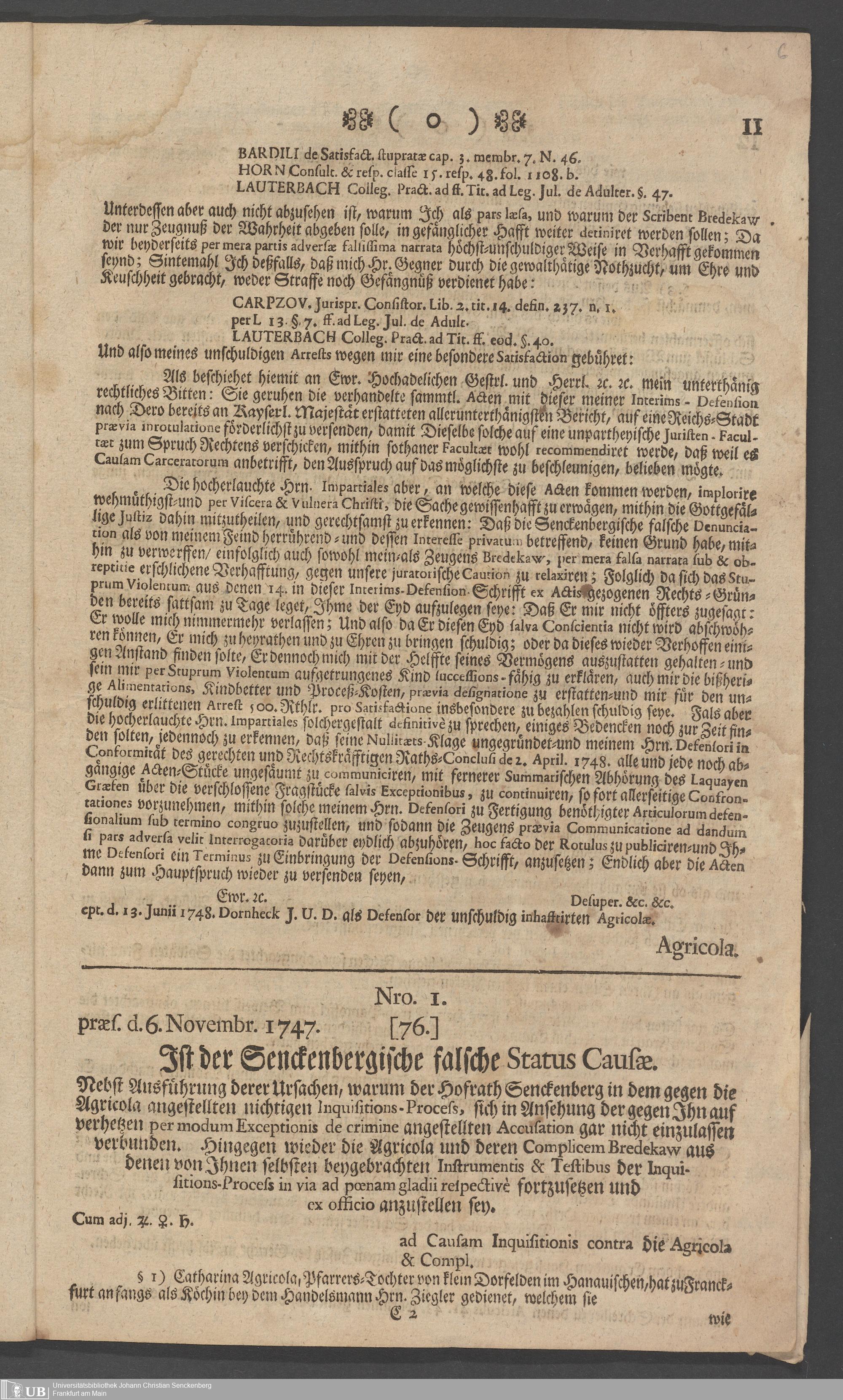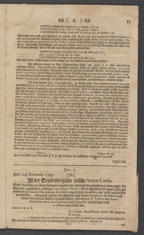Na 31 Nachlass Johann Christian Senckenberg, 73 - Prozeßakten Agricola (Druck) 1749. Nürnberger Urteil gegen Erasmus Senckenberg (Druck) 1761. Vergleichsverhandlung mit dem Senat (p. I.1.b.20)