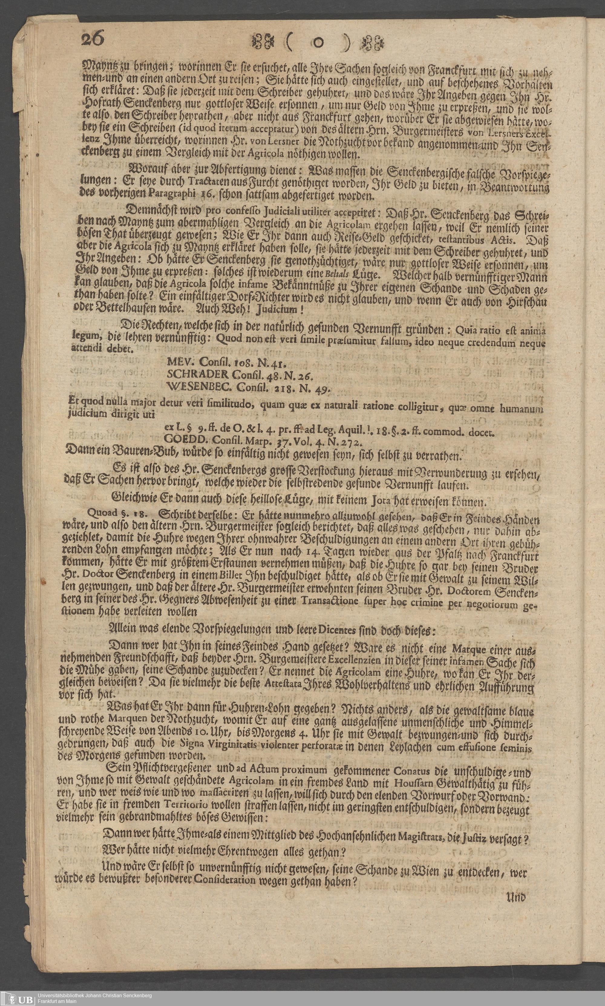 Na 31 Nachlass Johann Christian Senckenberg, 73 - Prozeßakten Agricola (Druck) 1749. Nürnberger Urteil gegen Erasmus Senckenberg (Druck) 1761. Vergleichsverhandlung mit dem Senat (p. I.1.b.20)
