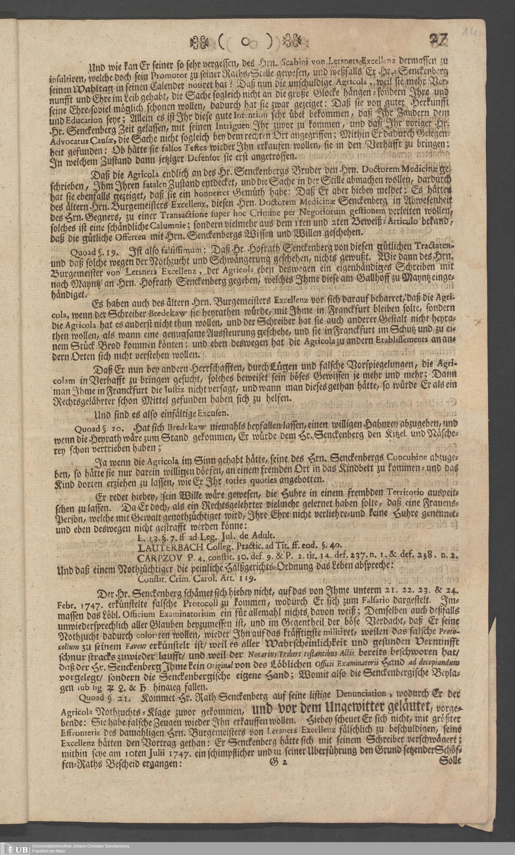 Na 31 Nachlass Johann Christian Senckenberg, 73 - Prozeßakten Agricola (Druck) 1749. Nürnberger Urteil gegen Erasmus Senckenberg (Druck) 1761. Vergleichsverhandlung mit dem Senat (p. I.1.b.20)