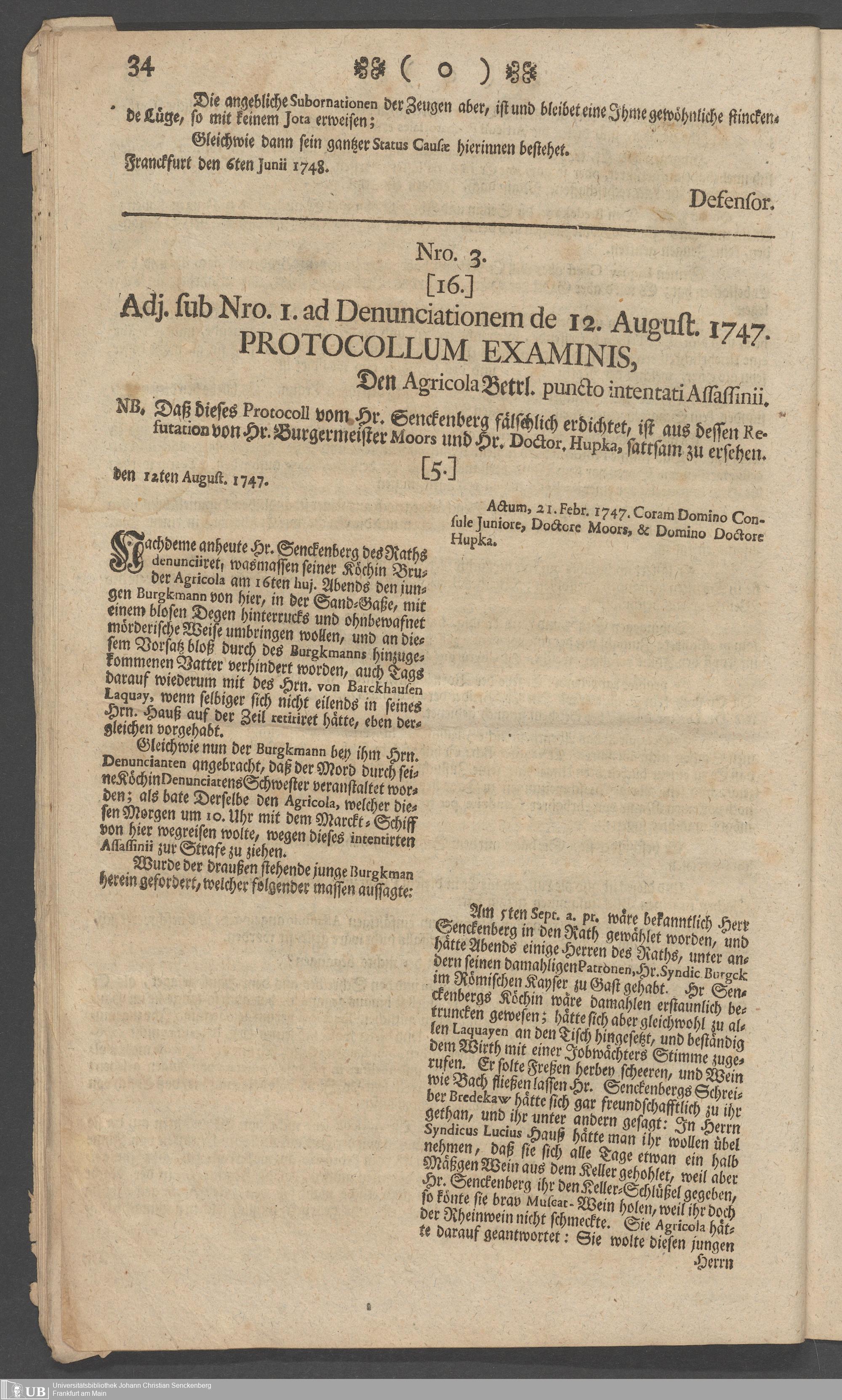 Na 31 Nachlass Johann Christian Senckenberg, 73 - Prozeßakten Agricola (Druck) 1749. Nürnberger Urteil gegen Erasmus Senckenberg (Druck) 1761. Vergleichsverhandlung mit dem Senat (p. I.1.b.20)