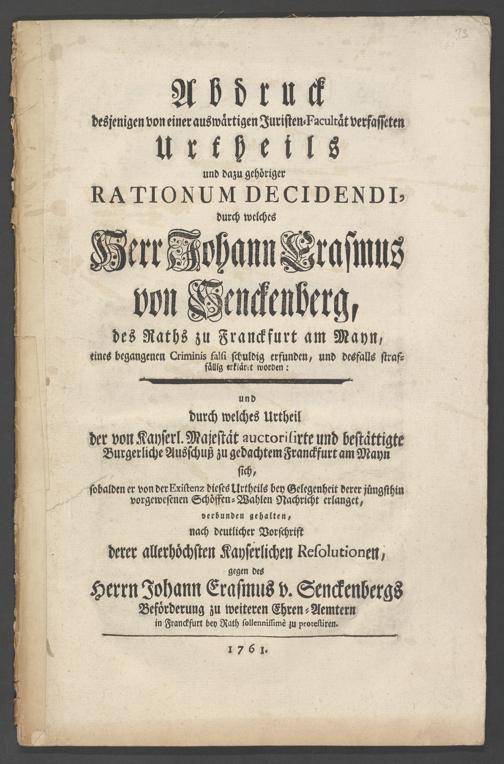 Na 31 Nachlass Johann Christian Senckenberg, 73 - Prozeßakten Agricola (Druck) 1749. Nürnberger Urteil gegen Erasmus Senckenberg (Druck) 1761. Vergleichsverhandlung mit dem Senat (p. I.1.b.20)
