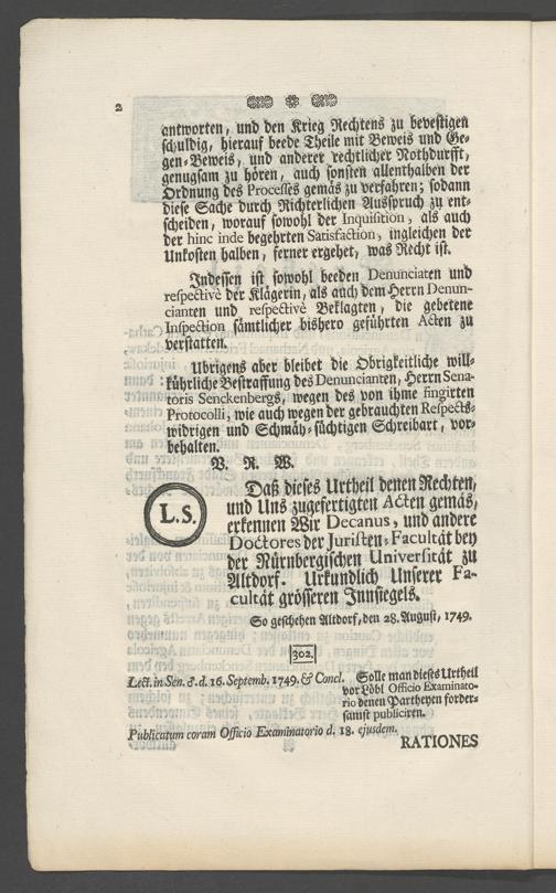 Na 31 Nachlass Johann Christian Senckenberg, 73 - Prozeßakten Agricola (Druck) 1749. Nürnberger Urteil gegen Erasmus Senckenberg (Druck) 1761. Vergleichsverhandlung mit dem Senat (p. I.1.b.20)