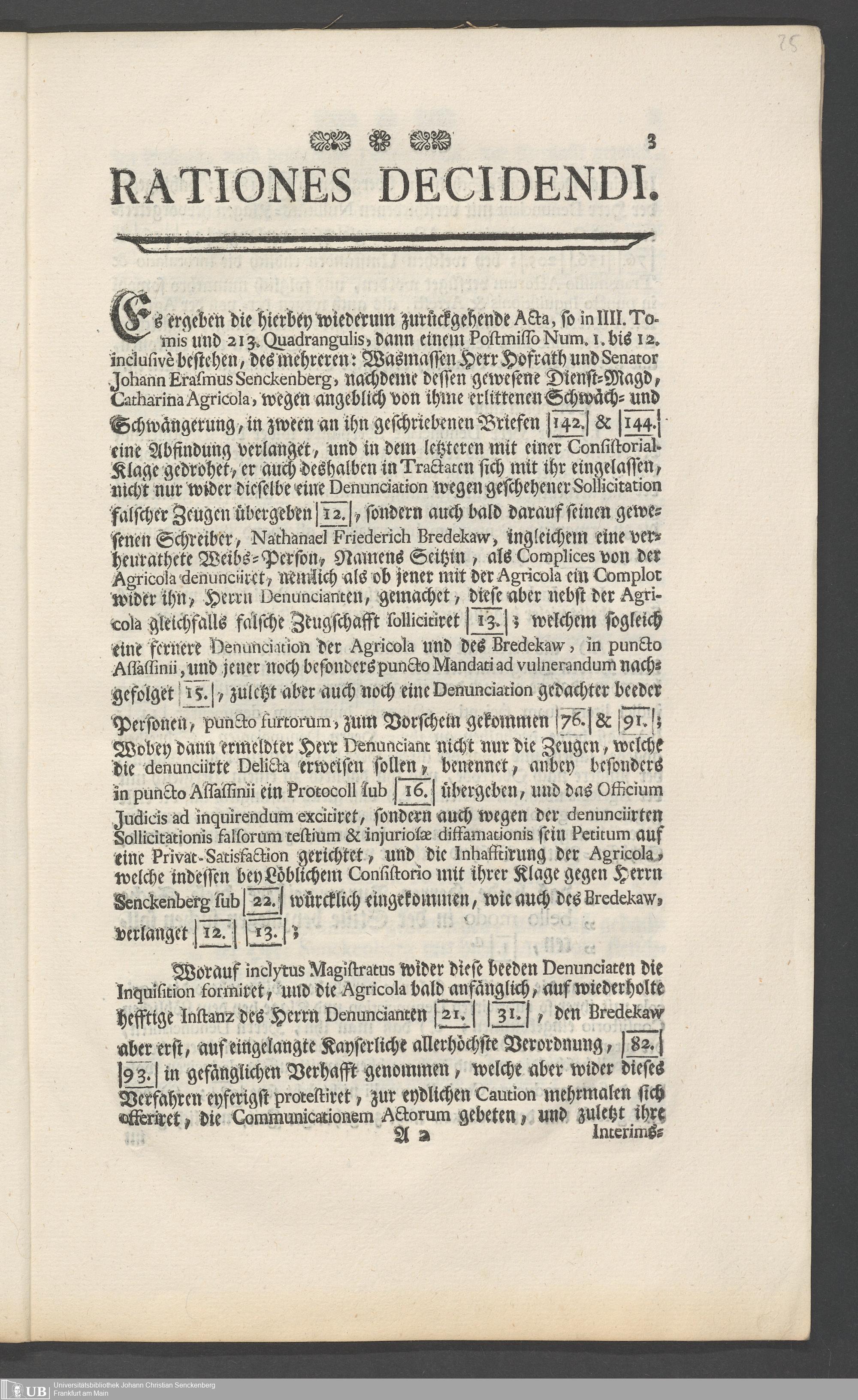 Na 31 Nachlass Johann Christian Senckenberg, 73 - Prozeßakten Agricola (Druck) 1749. Nürnberger Urteil gegen Erasmus Senckenberg (Druck) 1761. Vergleichsverhandlung mit dem Senat (p. I.1.b.20)