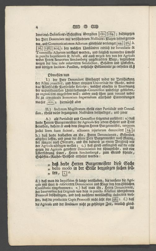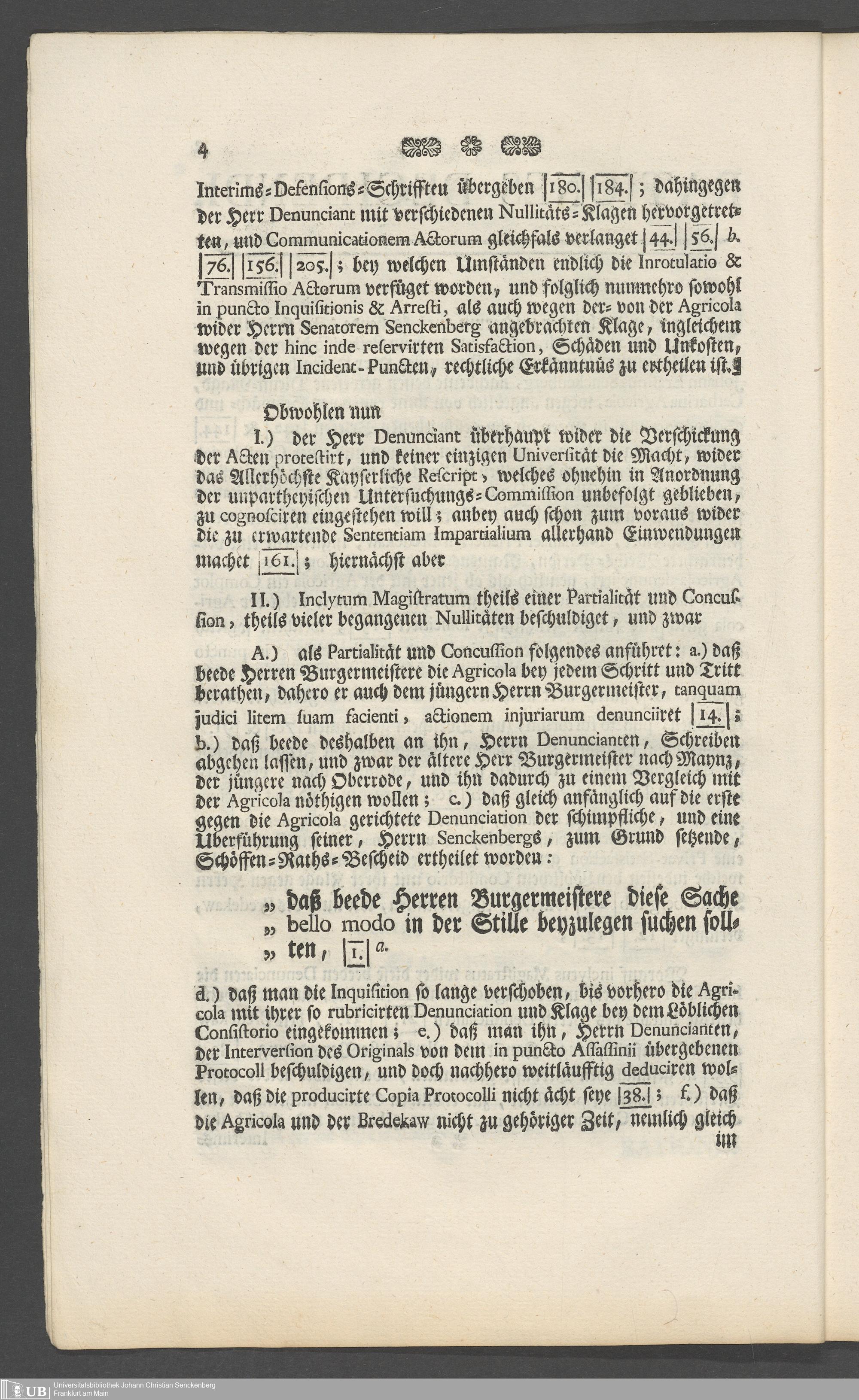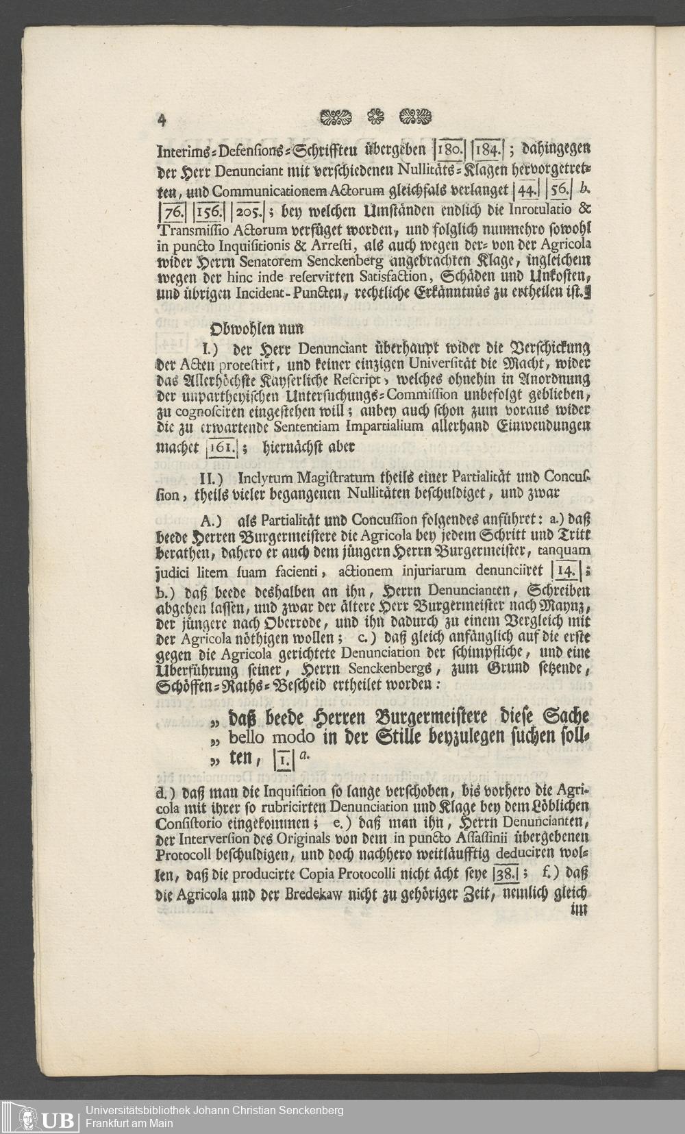 Na 31 Nachlass Johann Christian Senckenberg, 73 - Prozeßakten Agricola (Druck) 1749. Nürnberger Urteil gegen Erasmus Senckenberg (Druck) 1761. Vergleichsverhandlung mit dem Senat (p. I.1.b.20)