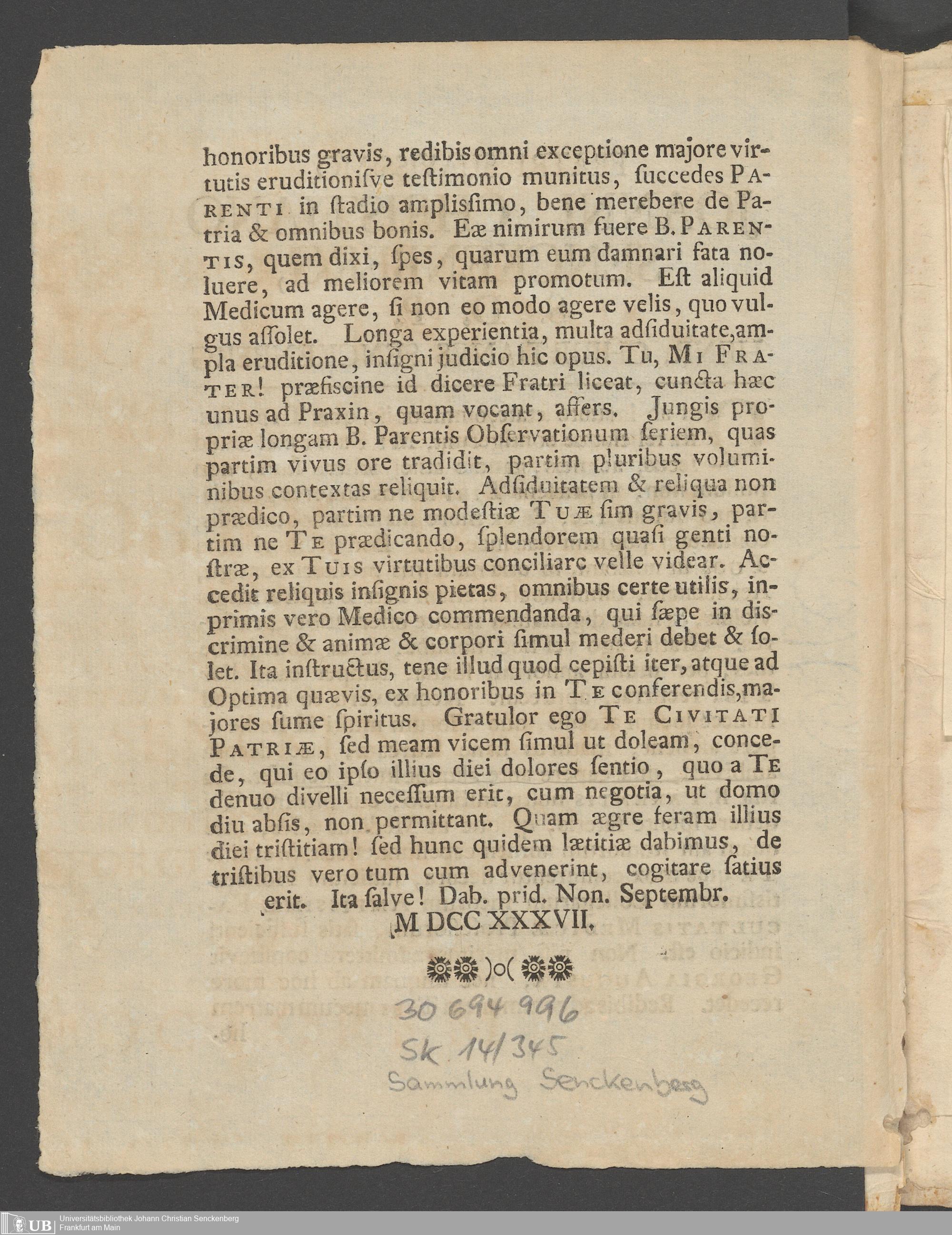 Na 31 Nachlass Johann Christian Senckenberg, 83 - Dissertation Johann Christian Senckenbergs