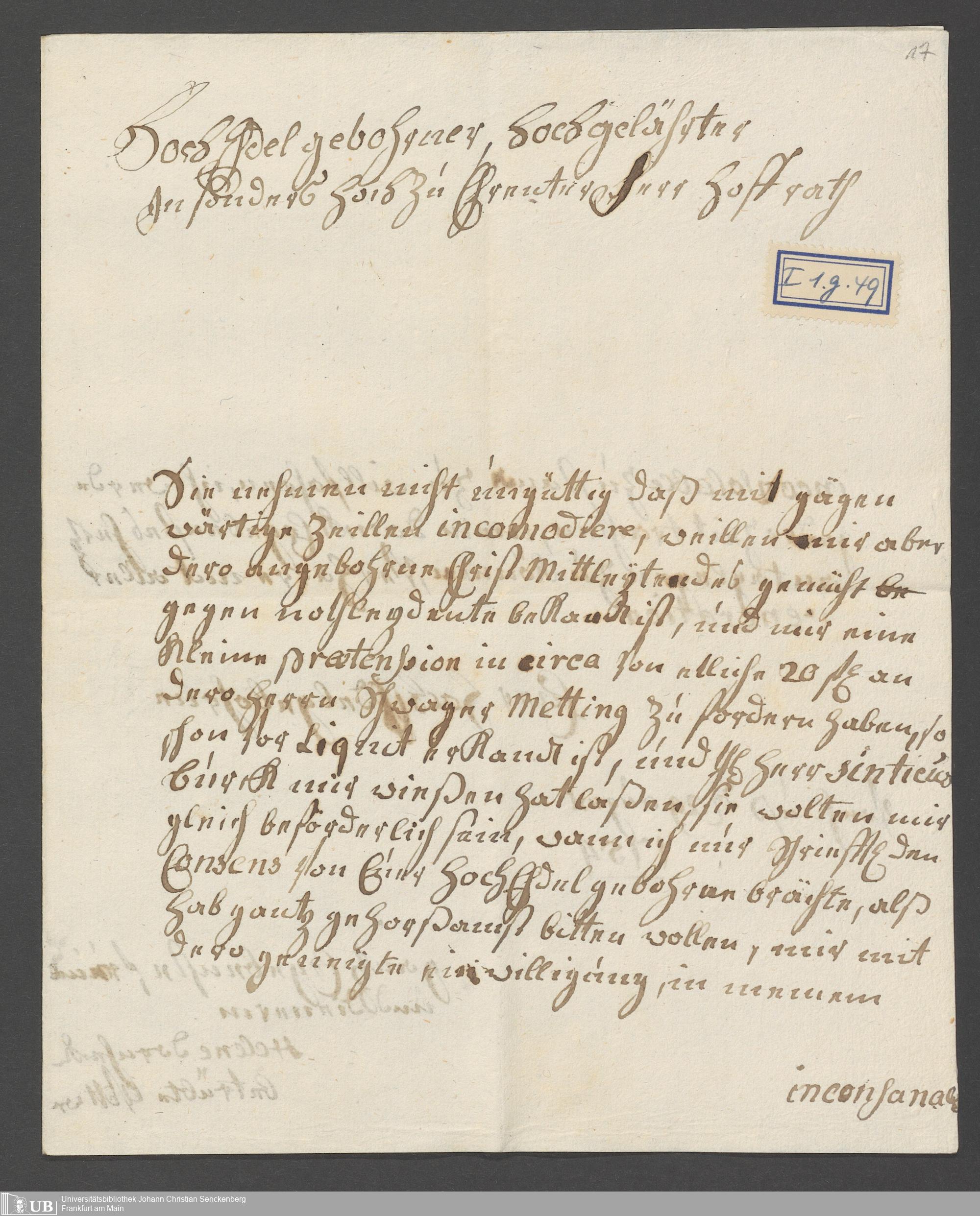 Na 31 Nachlass Johann Christian Senckenberg, 110 - Briefe an Johann Christian Senckenberg von verschiedenen Absender (A-D) (p. I.1.g.49)