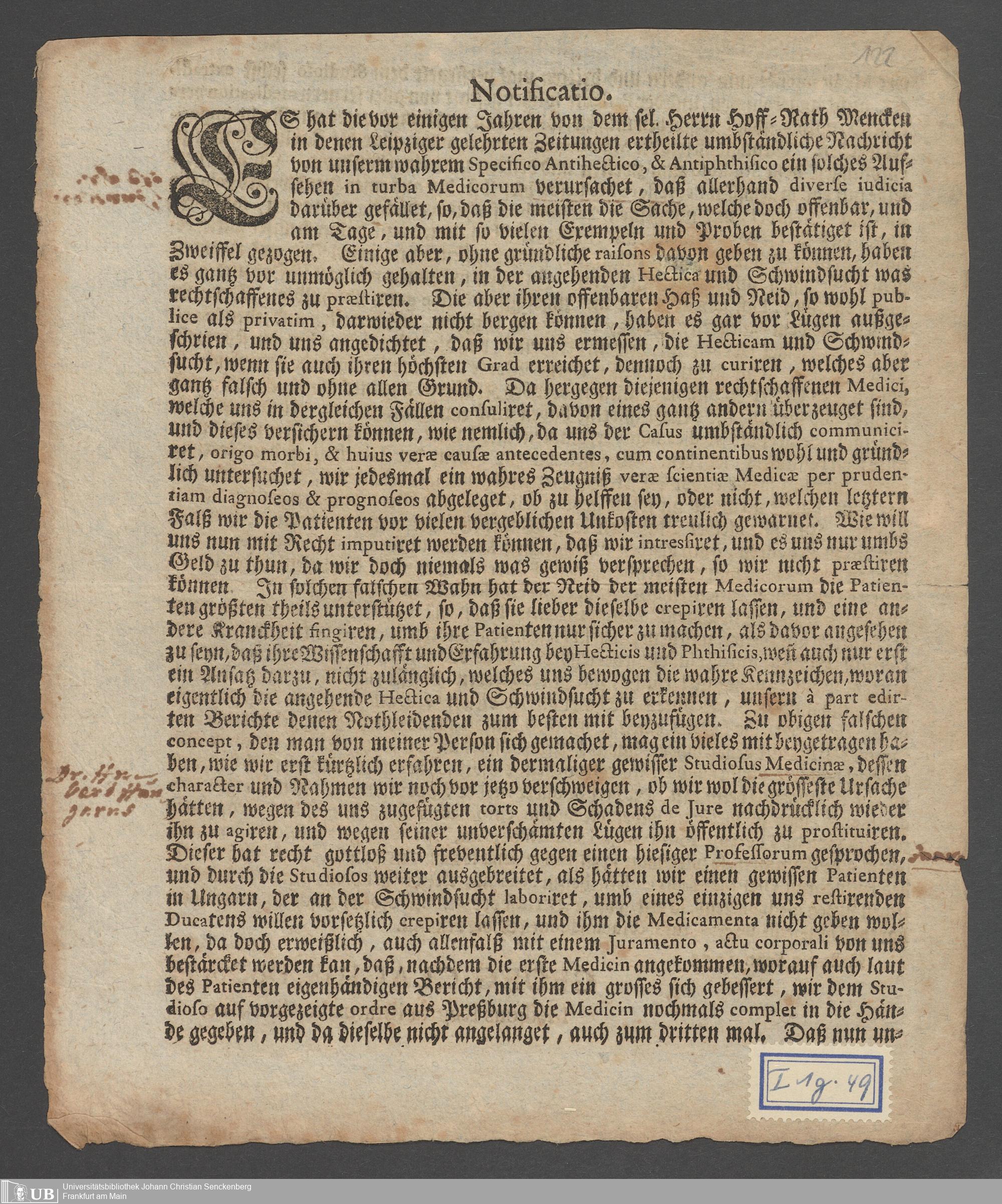 Na 31 Nachlass Johann Christian Senckenberg, 110 - Briefe an Johann Christian Senckenberg von verschiedenen Absender (A-D) (p. I.1.g.49)