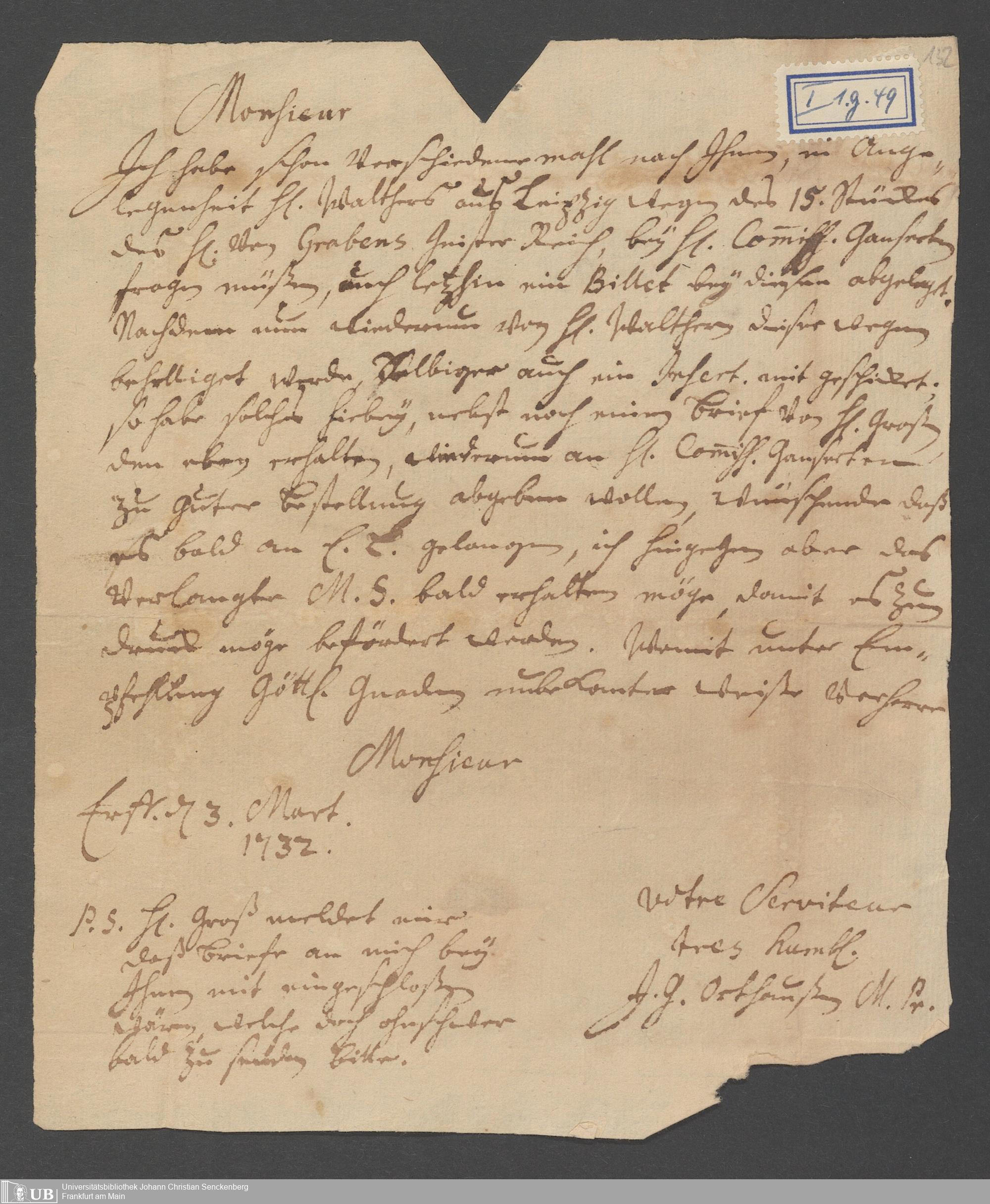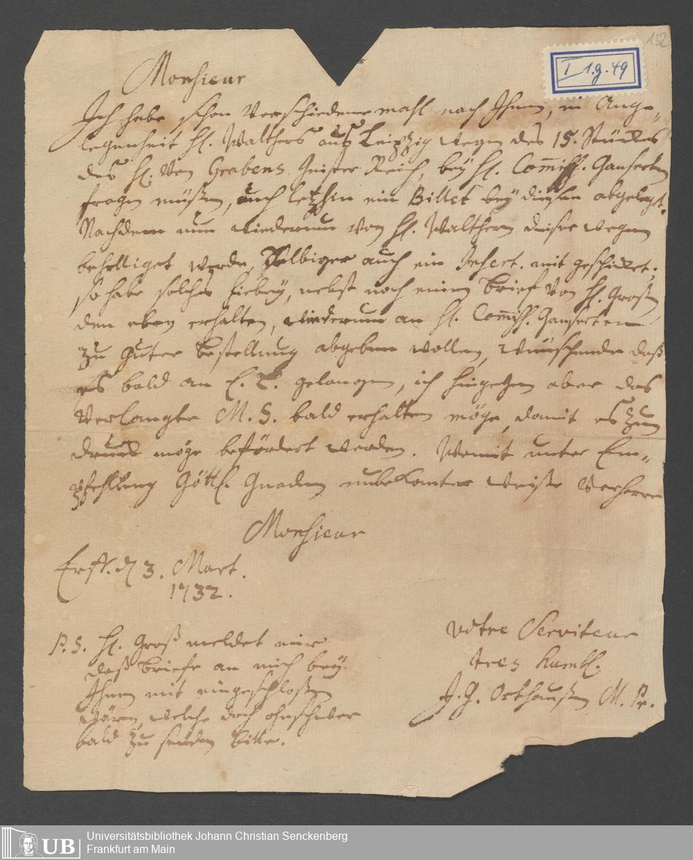 Na 31 Nachlass Johann Christian Senckenberg, 111 - Briefe an Johann Christian Senckenberg von verschiedenen Absendern (E-Z) (p. I.1.g.50)