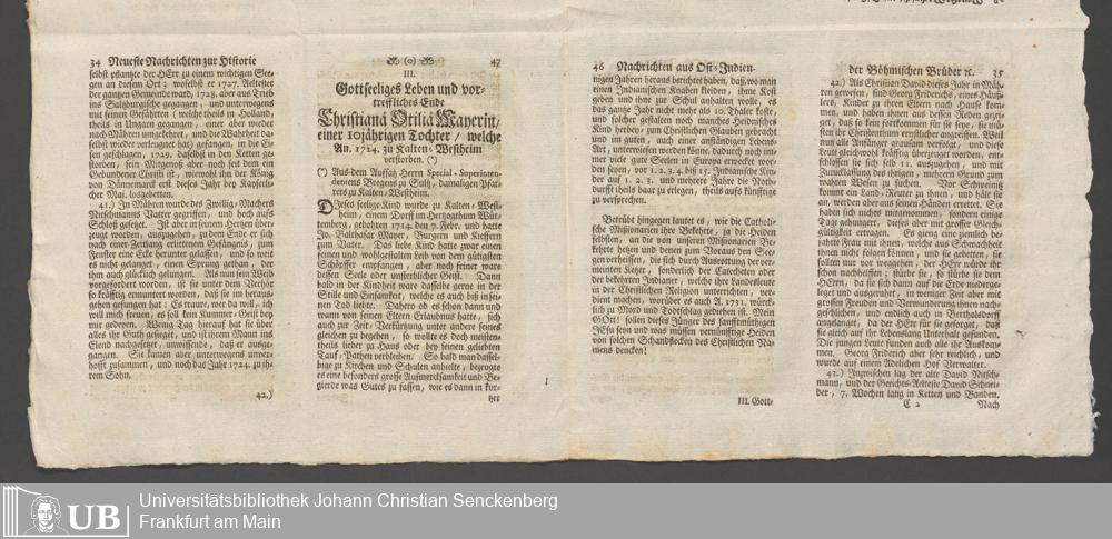 Na 31 Nachlass Johann Christian Senckenberg, 148 - Nikolaus Ludwig von Zinsendorfs "Altes und Neues aus dem Reich Gottes" (2 Bände) (p. I.2.b.80)