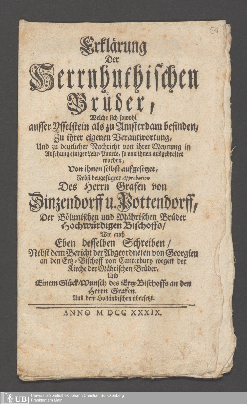 Na 31 Nachlass Johann Christian Senckenberg, 149 - Nikolaus Ludwig von Zinsendorf: "Bedenken vom Separatismo"; "Erklärung der Herrenhuthischen Brüder"