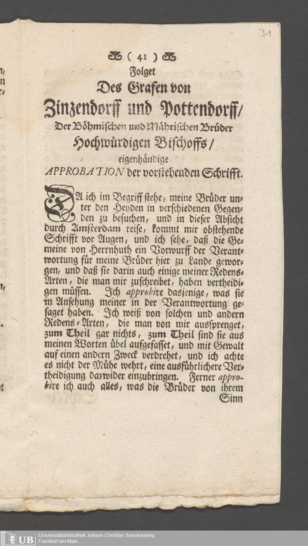 Na 31 Nachlass Johann Christian Senckenberg, 149 - Nikolaus Ludwig von Zinsendorf: "Bedenken vom Separatismo"; "Erklärung der Herrenhuthischen Brüder"