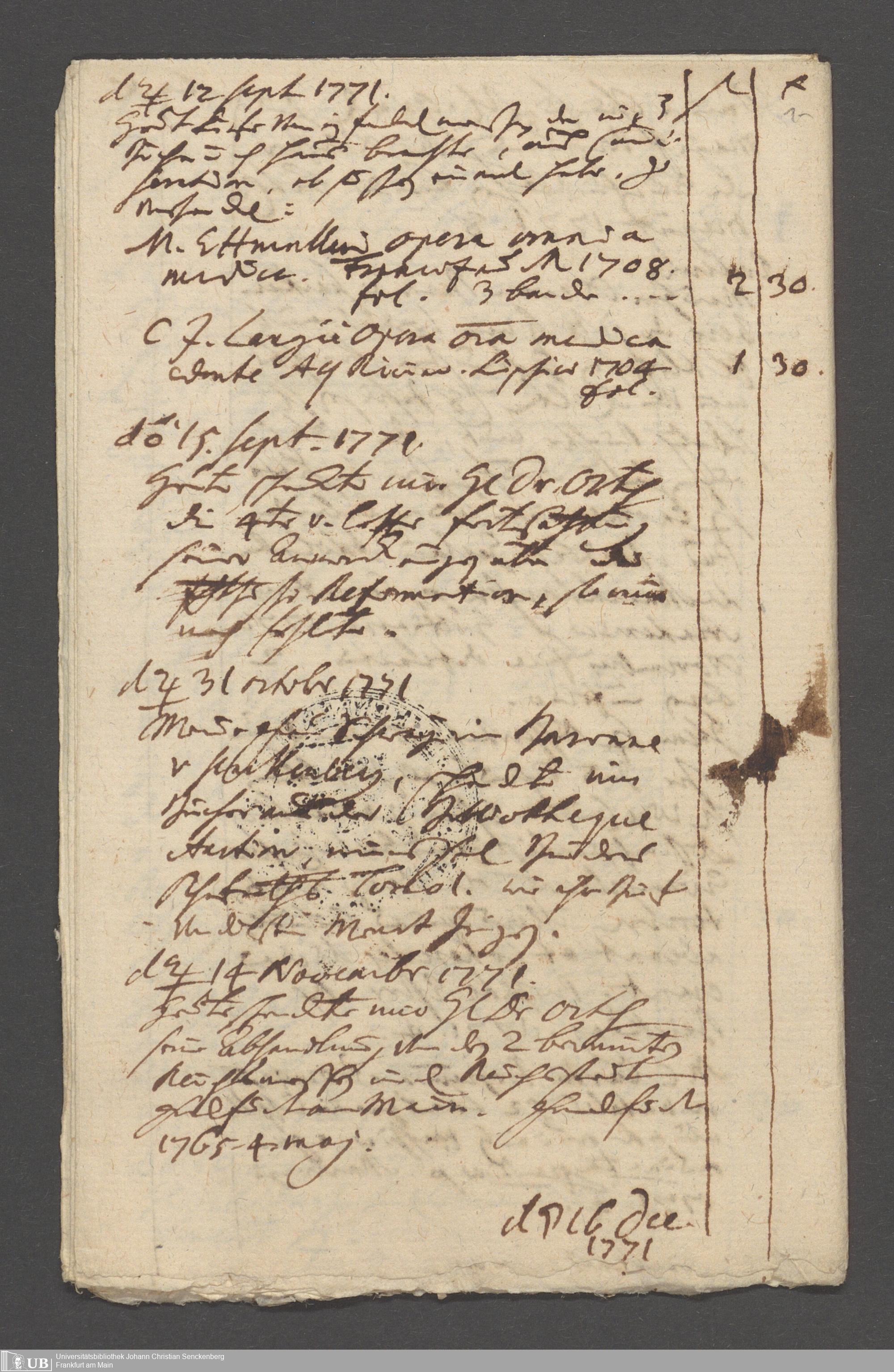 Na 31 Nachlass Johann Christian Senckenberg, 215 - Aufzeichnungen über Bücherkäufe und Schenkungen