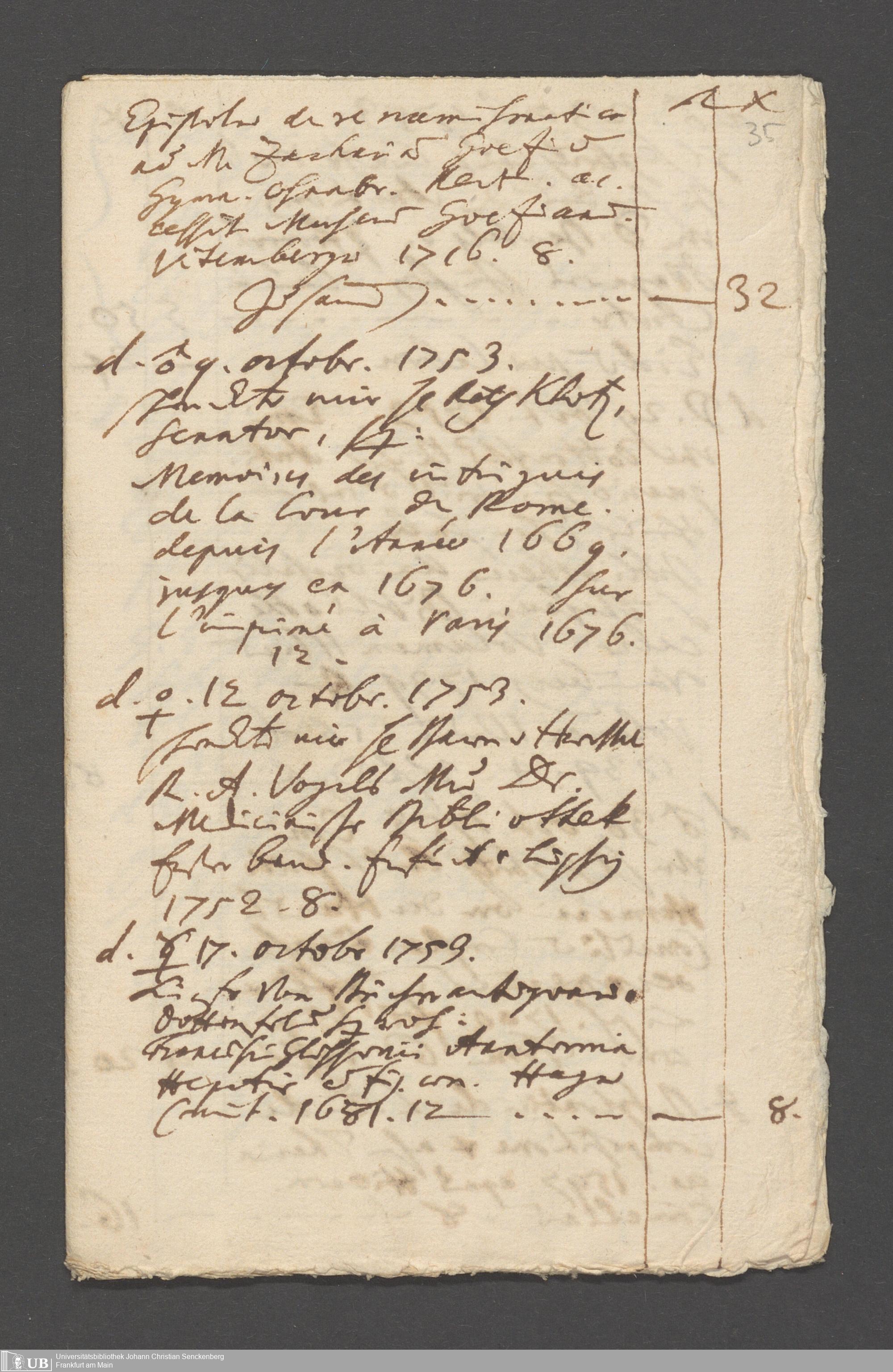 Na 31 Nachlass Johann Christian Senckenberg, 215 - Aufzeichnungen über Bücherkäufe und Schenkungen
