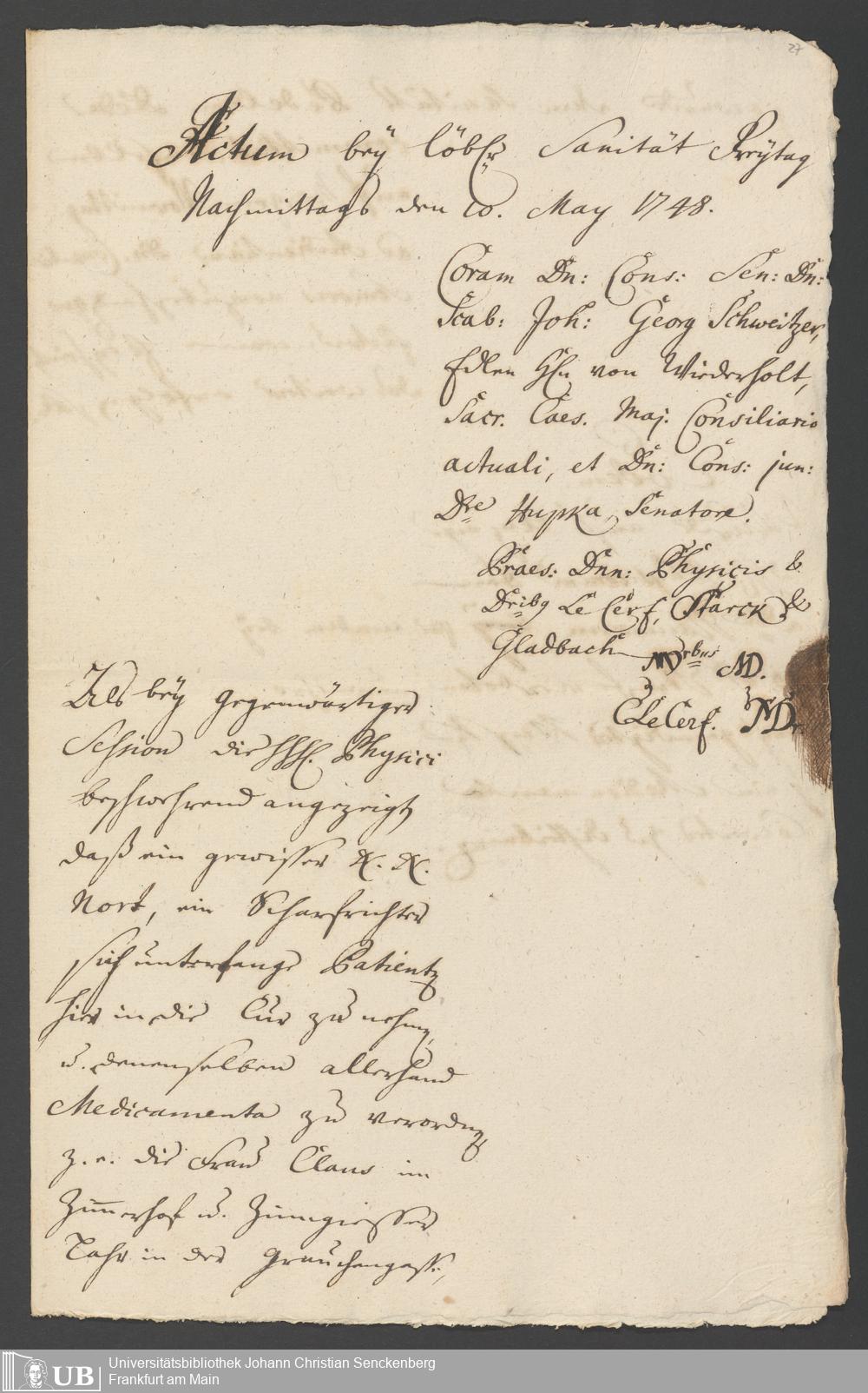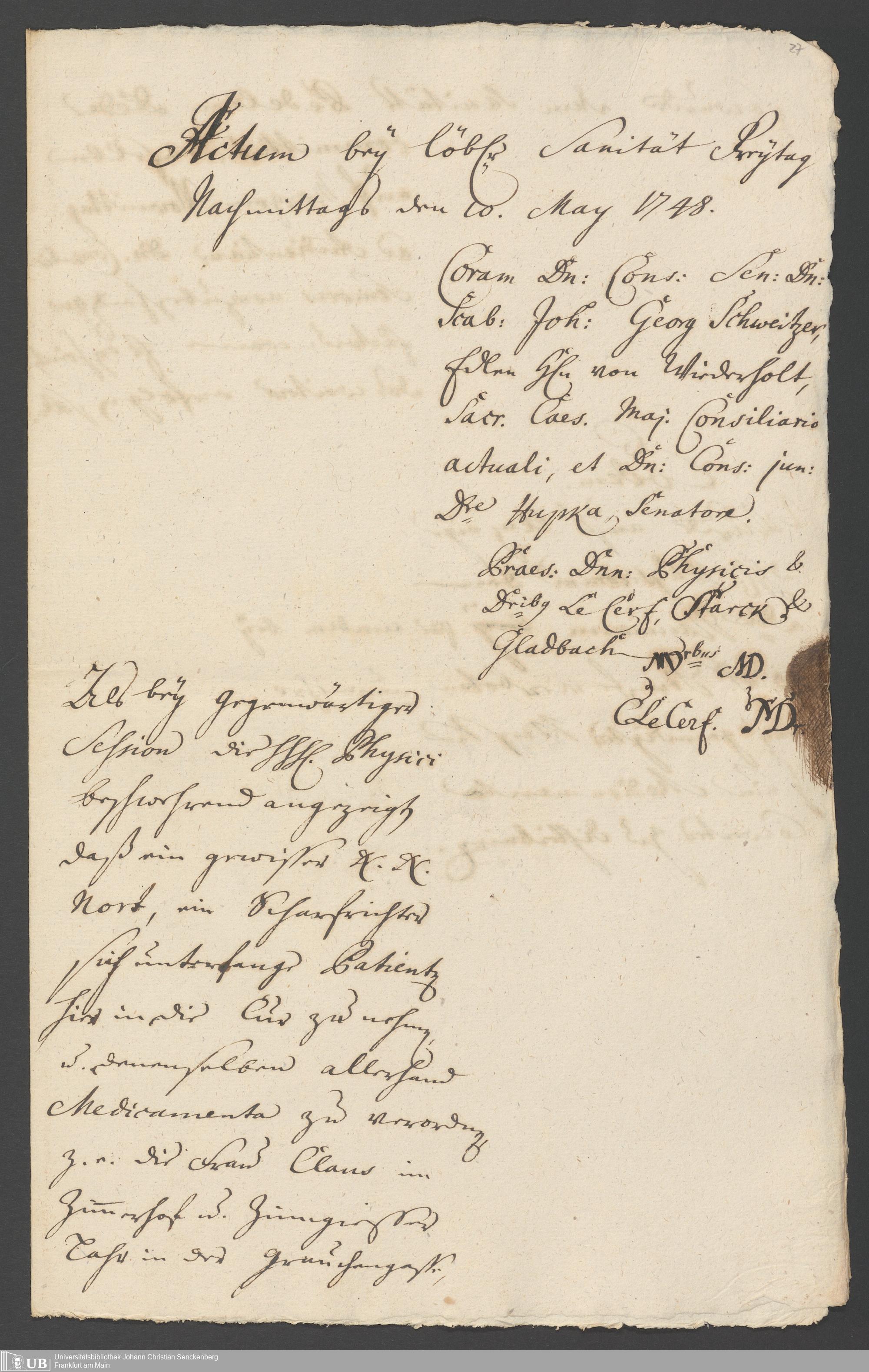 Na 31 Nachlass Johann Christian Senckenberg, 284 - Aufzeichnungen und Protokolle des Sanitätsamtes
