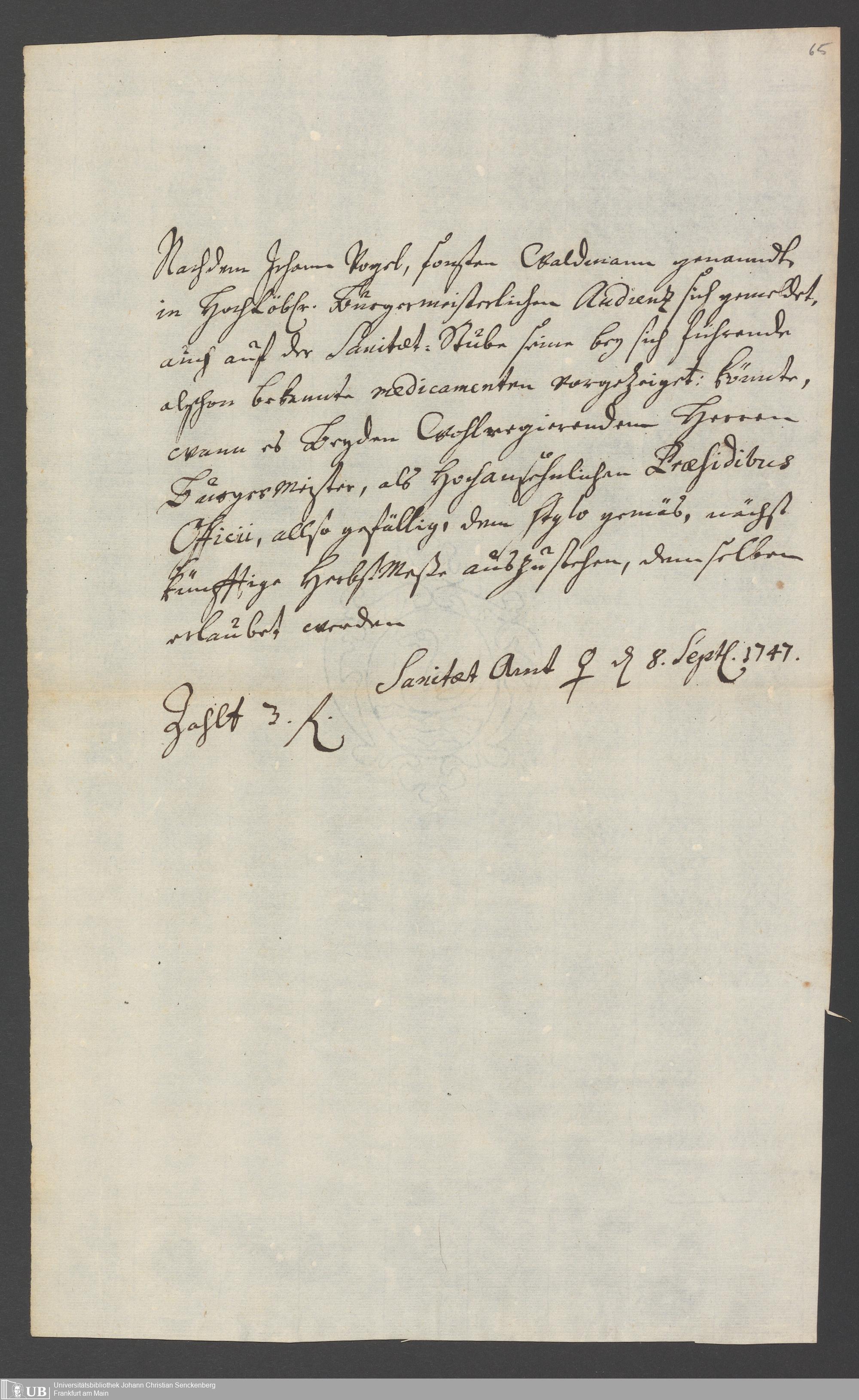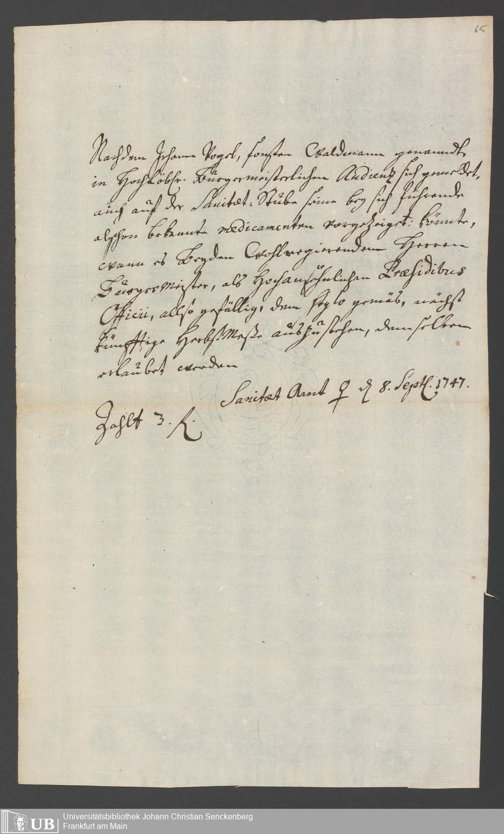 Na 31 Nachlass Johann Christian Senckenberg, 286 - Verfügungen des Sanitätsamtes