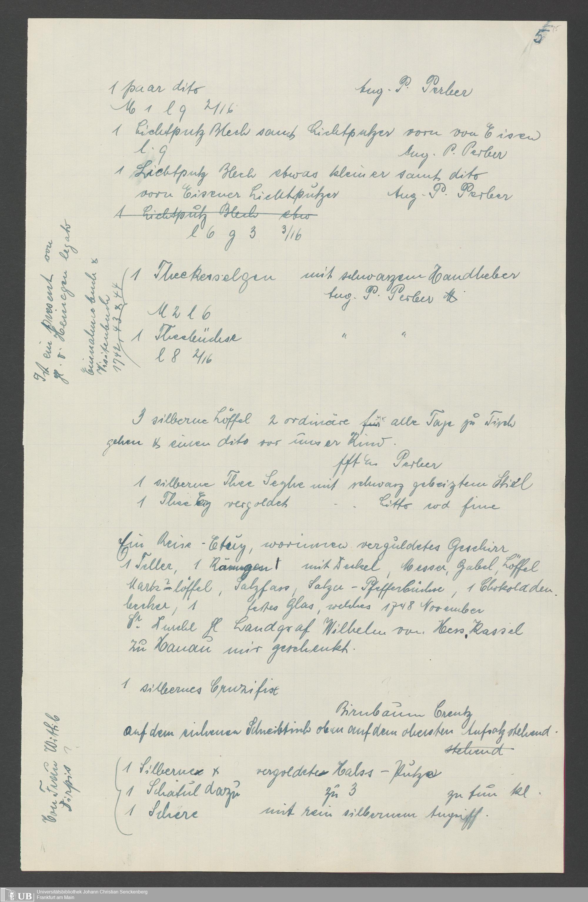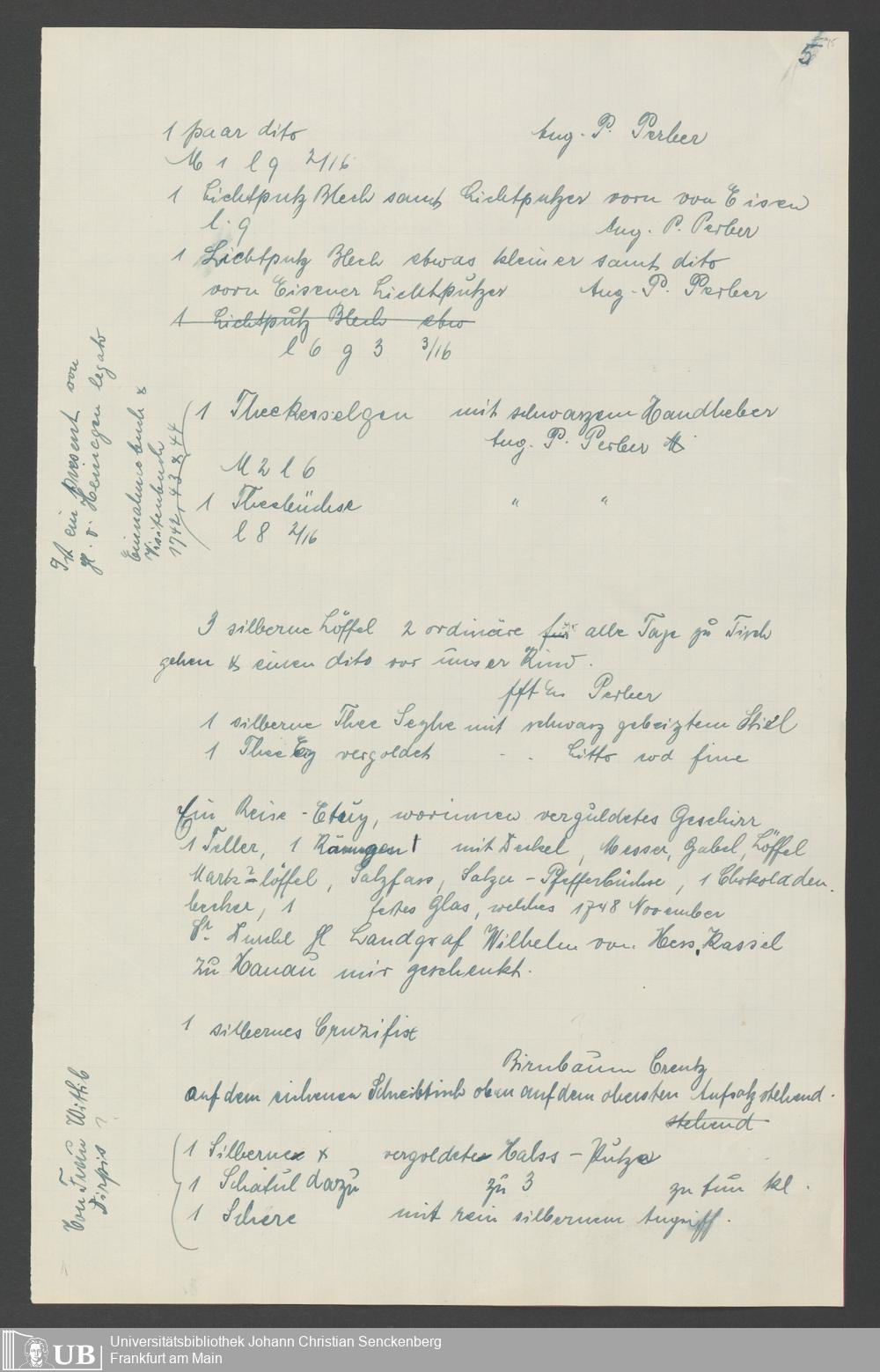 Na 31 Nachlass Johann Christian Senckenberg, 317 - Inventare über Haushaltungsgeräte, Mobilien, Instrumente, Bücher, Gold Silber, Juwelen