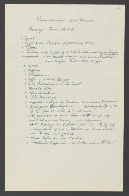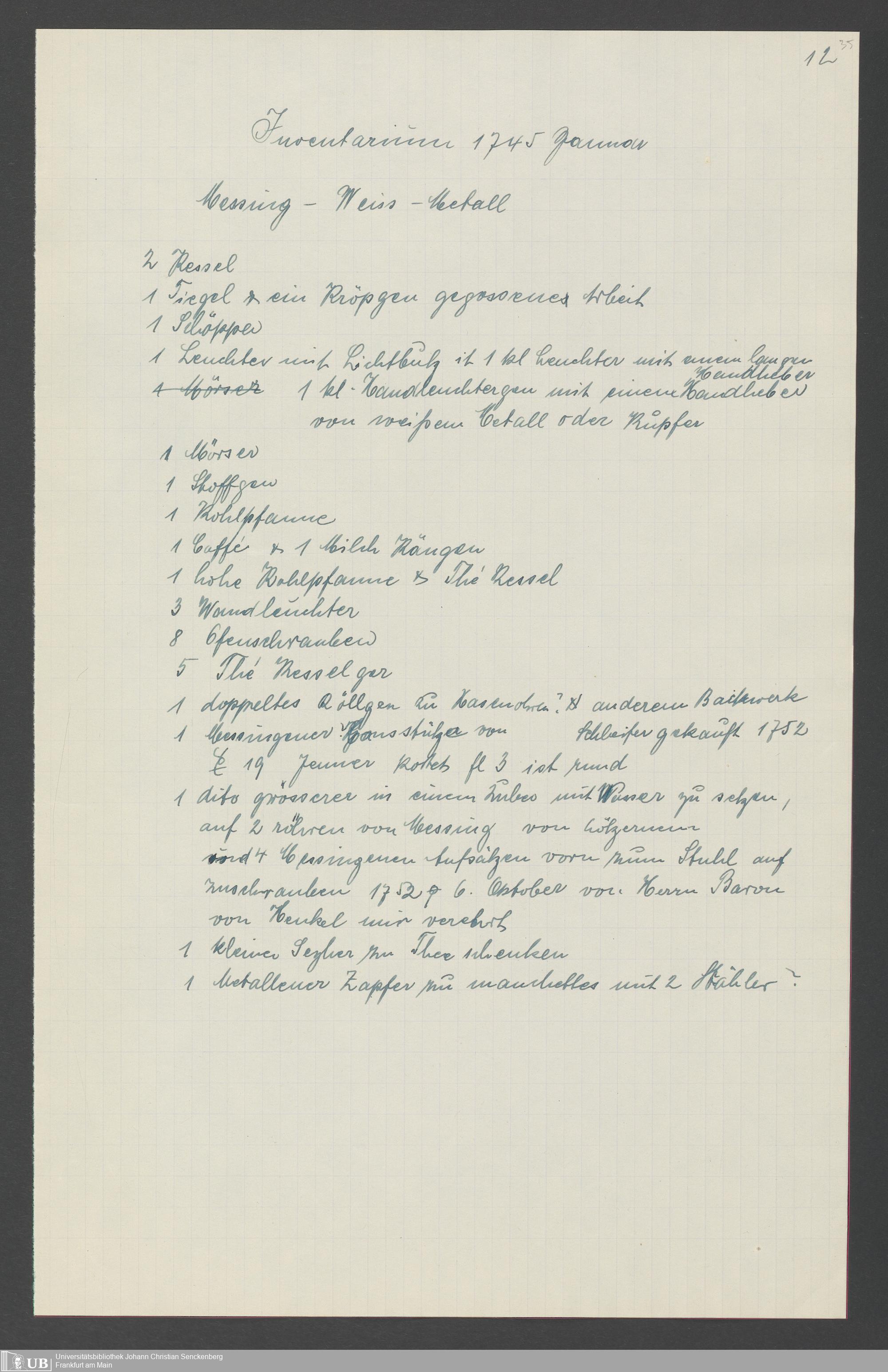 Na 31 Nachlass Johann Christian Senckenberg, 317 - Inventare über Haushaltungsgeräte, Mobilien, Instrumente, Bücher, Gold Silber, Juwelen