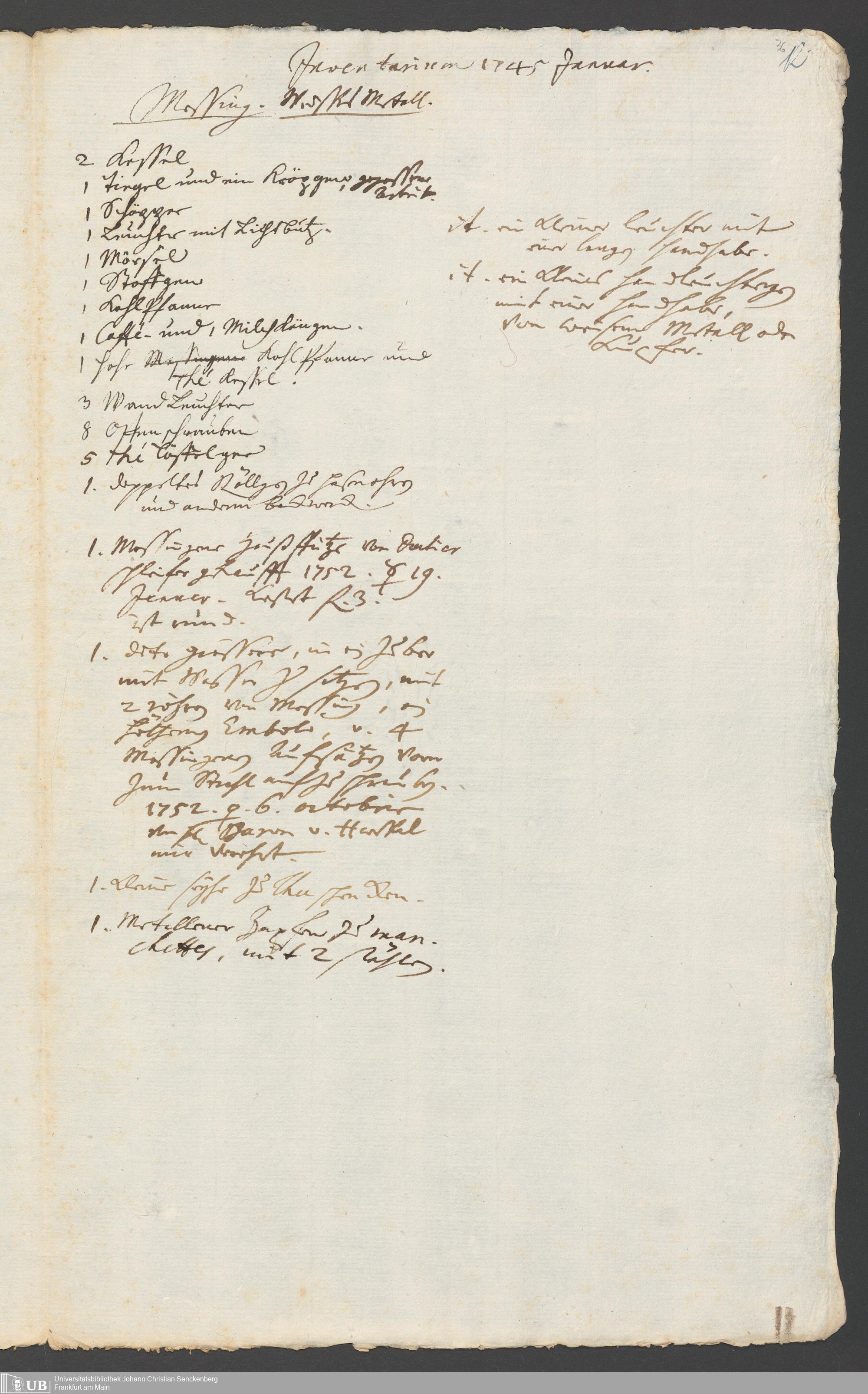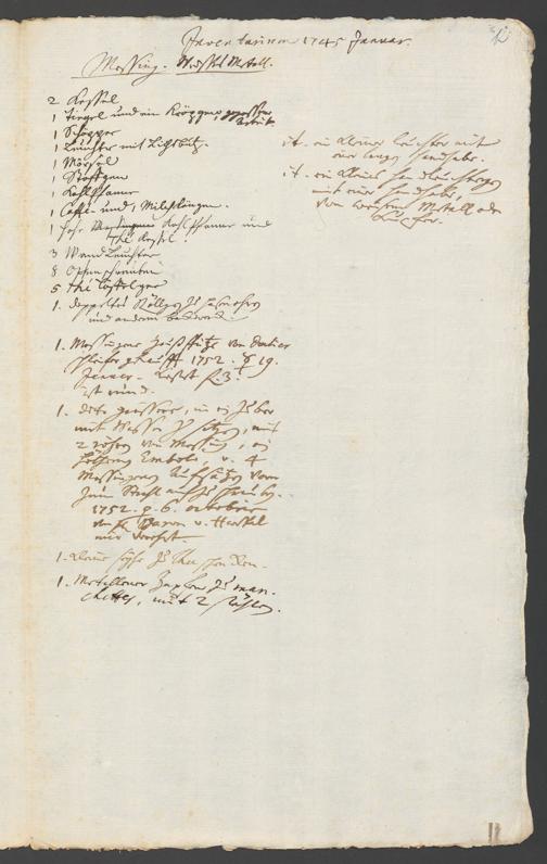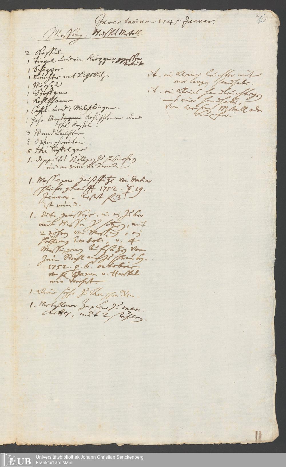Na 31 Nachlass Johann Christian Senckenberg, 317 - Inventare über Haushaltungsgeräte, Mobilien, Instrumente, Bücher, Gold Silber, Juwelen