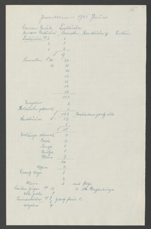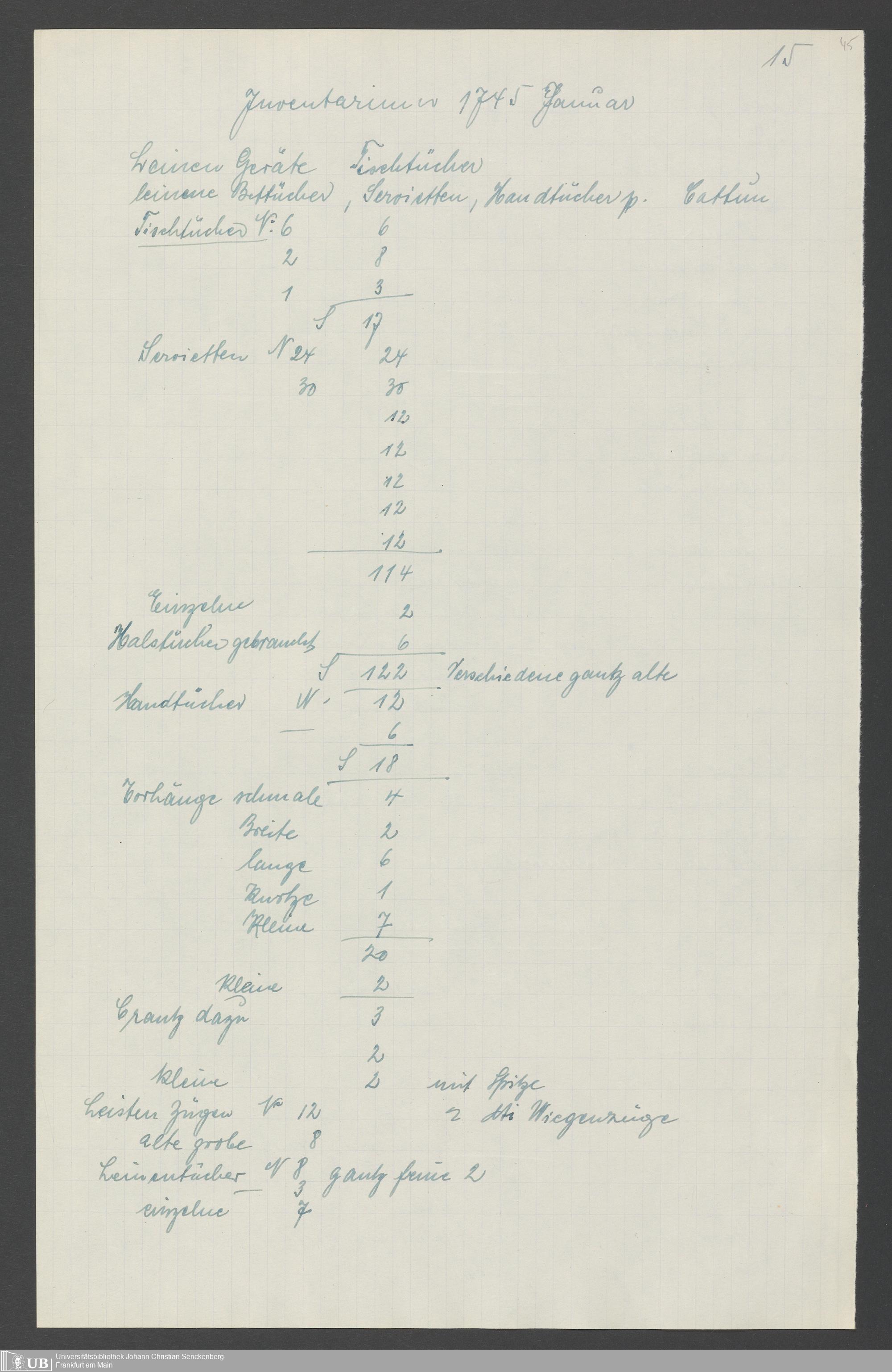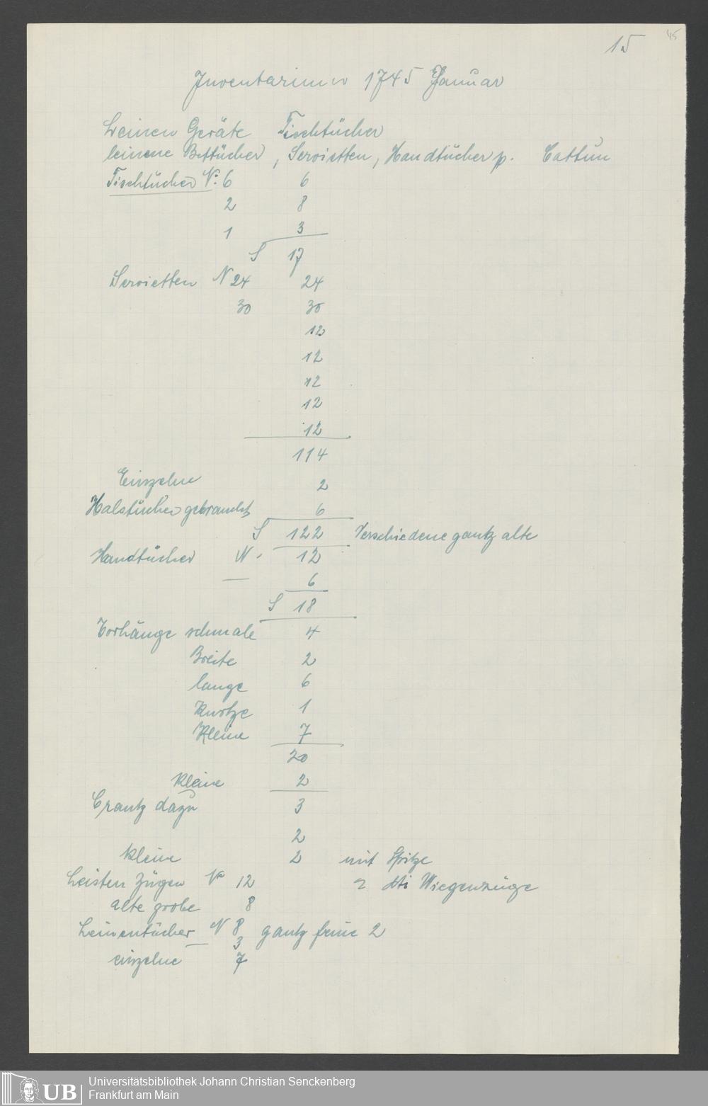 Na 31 Nachlass Johann Christian Senckenberg, 317 - Inventare über Haushaltungsgeräte, Mobilien, Instrumente, Bücher, Gold Silber, Juwelen