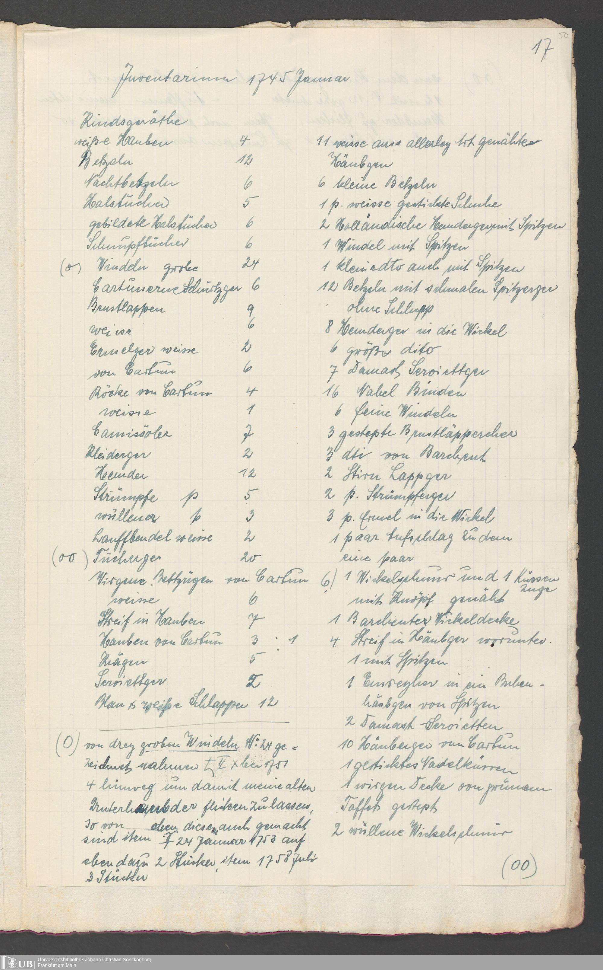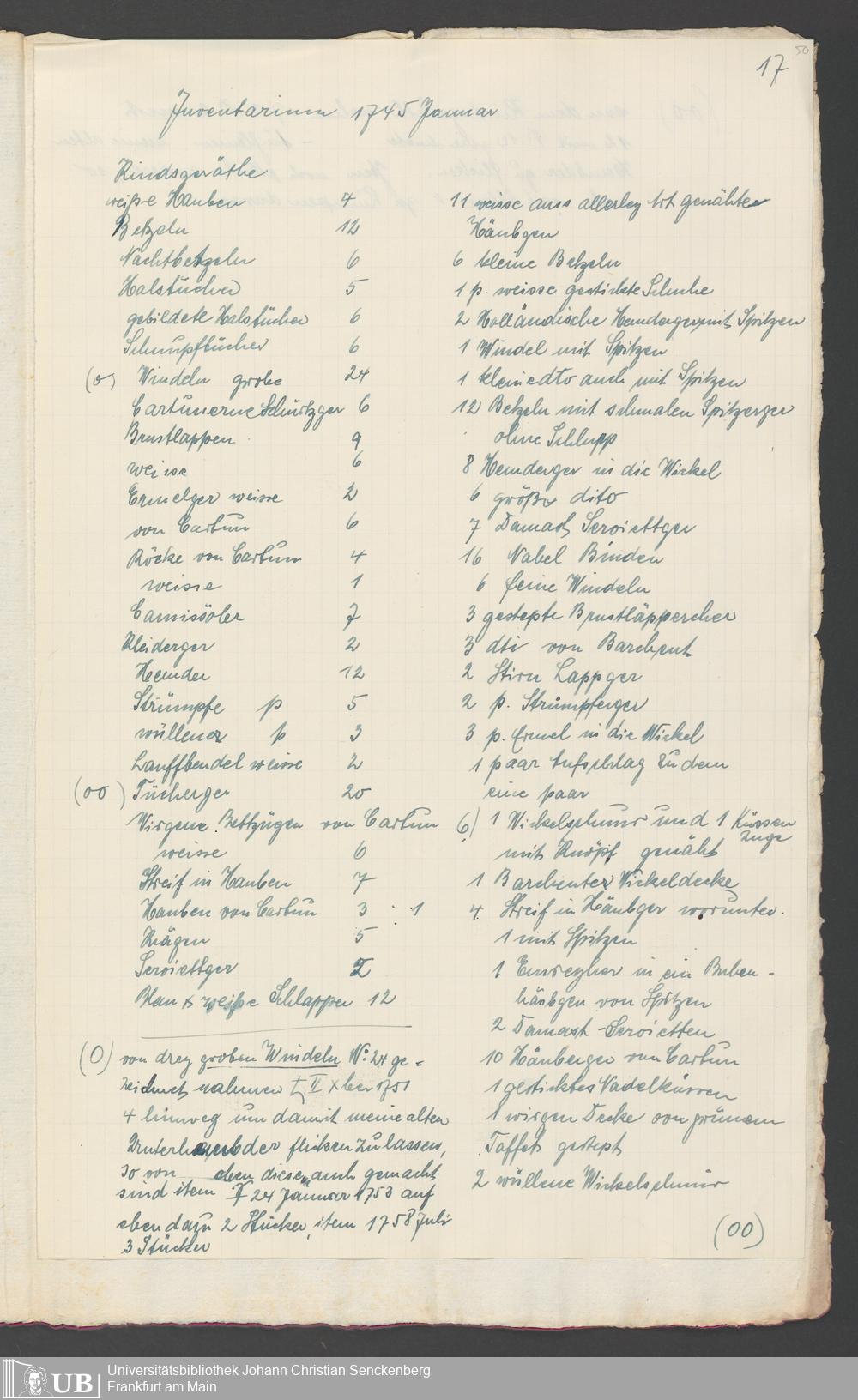 Na 31 Nachlass Johann Christian Senckenberg, 317 - Inventare über Haushaltungsgeräte, Mobilien, Instrumente, Bücher, Gold Silber, Juwelen