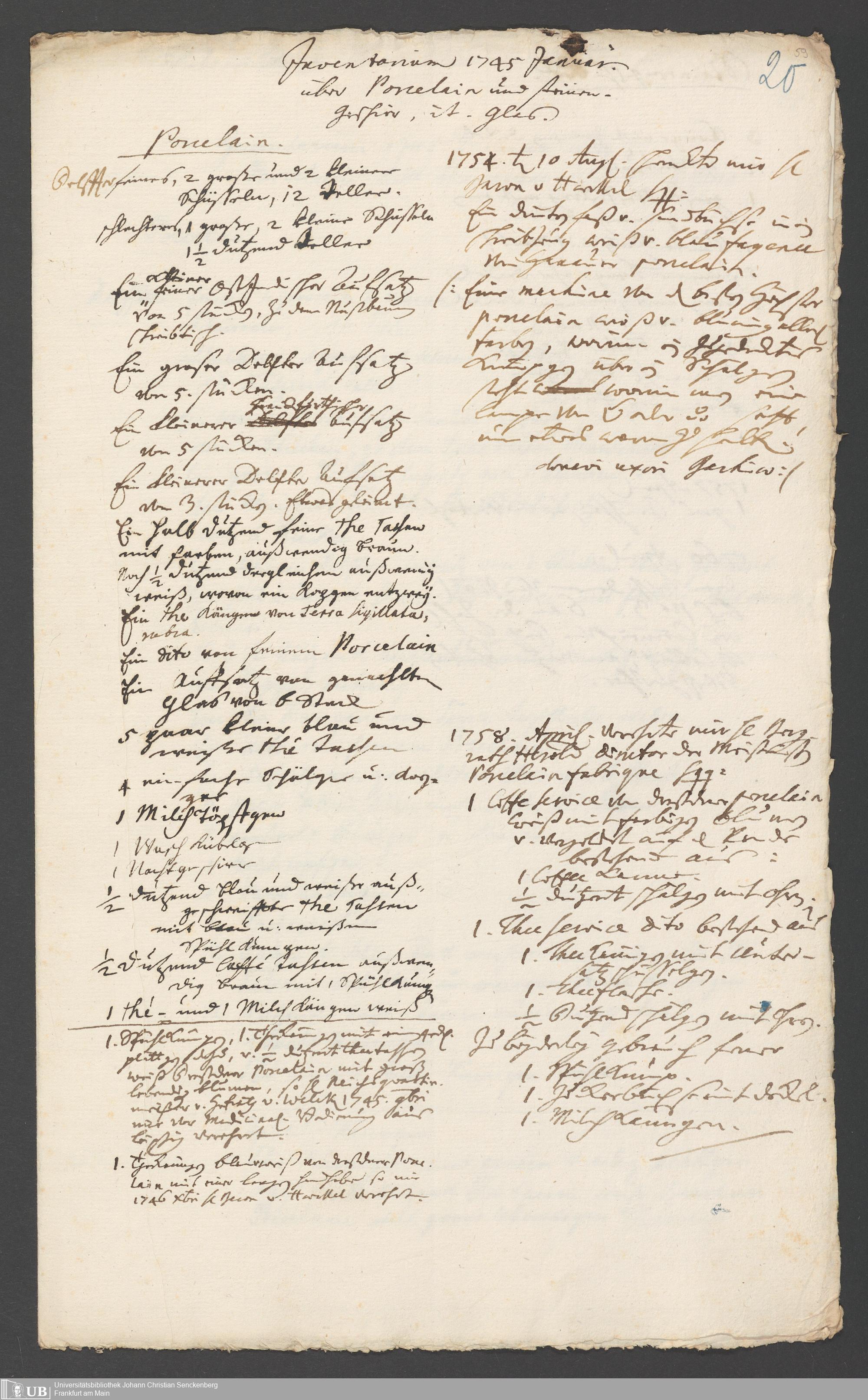 Na 31 Nachlass Johann Christian Senckenberg, 317 - Inventare über Haushaltungsgeräte, Mobilien, Instrumente, Bücher, Gold Silber, Juwelen