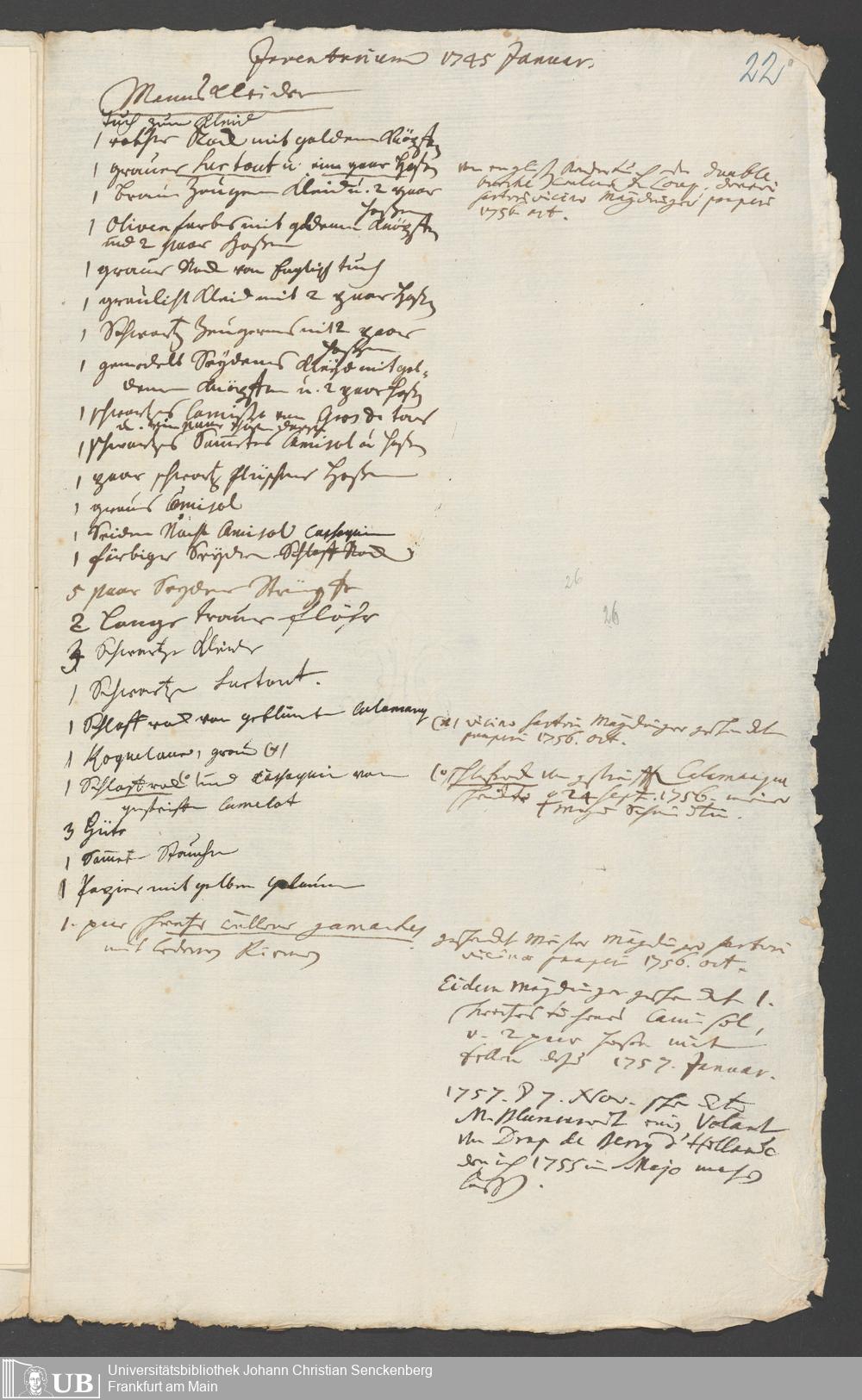 Na 31 Nachlass Johann Christian Senckenberg, 317 - Inventare über Haushaltungsgeräte, Mobilien, Instrumente, Bücher, Gold Silber, Juwelen