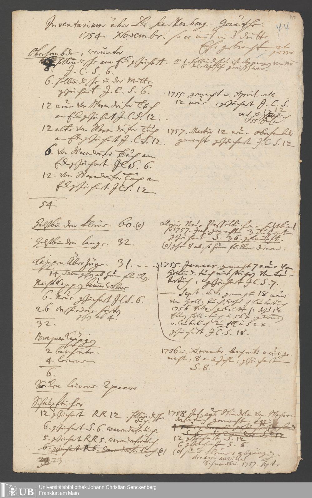 Na 31 Nachlass Johann Christian Senckenberg, 317 - Inventare über Haushaltungsgeräte, Mobilien, Instrumente, Bücher, Gold Silber, Juwelen