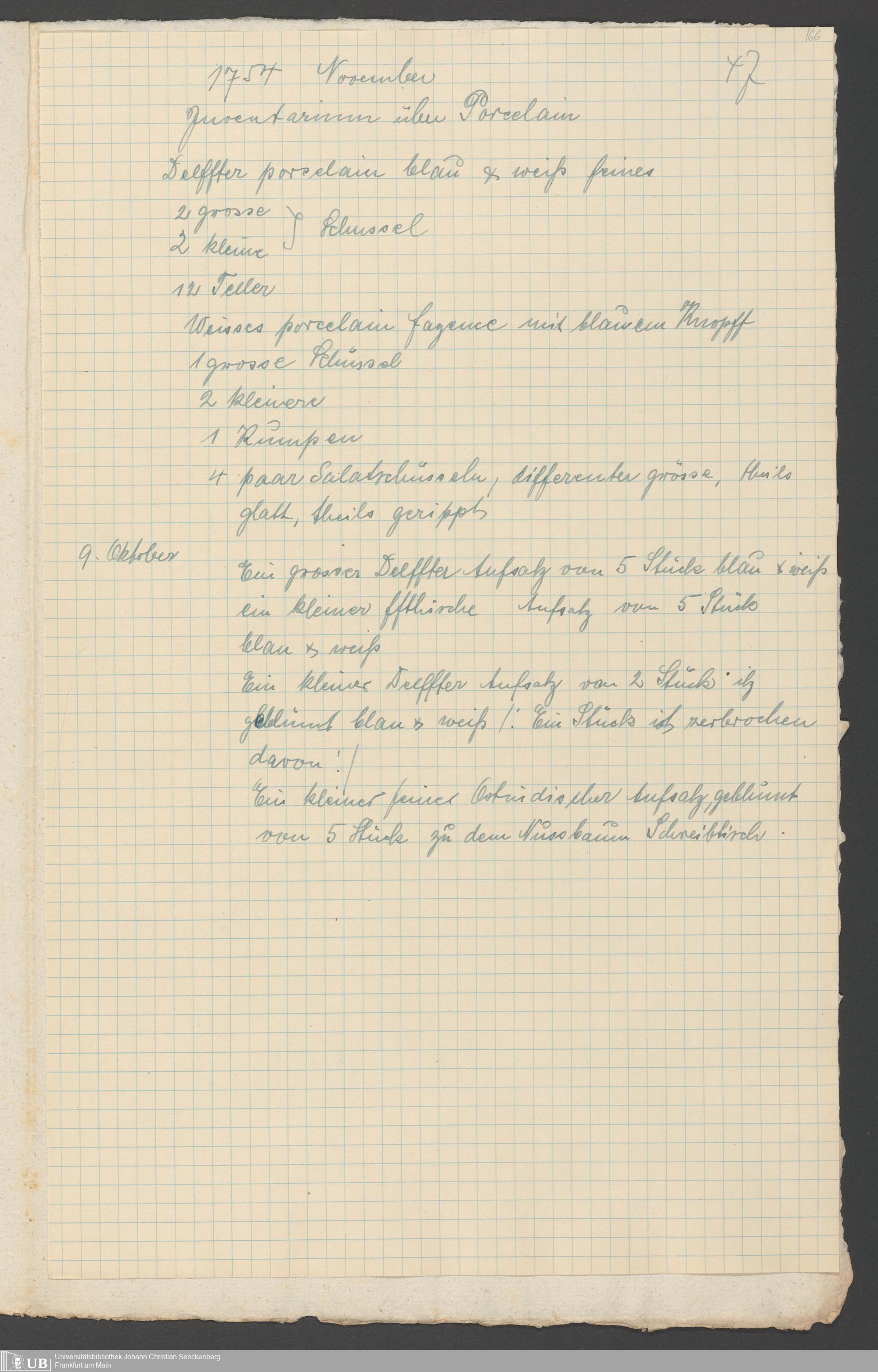 Na 31 Nachlass Johann Christian Senckenberg, 317 - Inventare über Haushaltungsgeräte, Mobilien, Instrumente, Bücher, Gold Silber, Juwelen