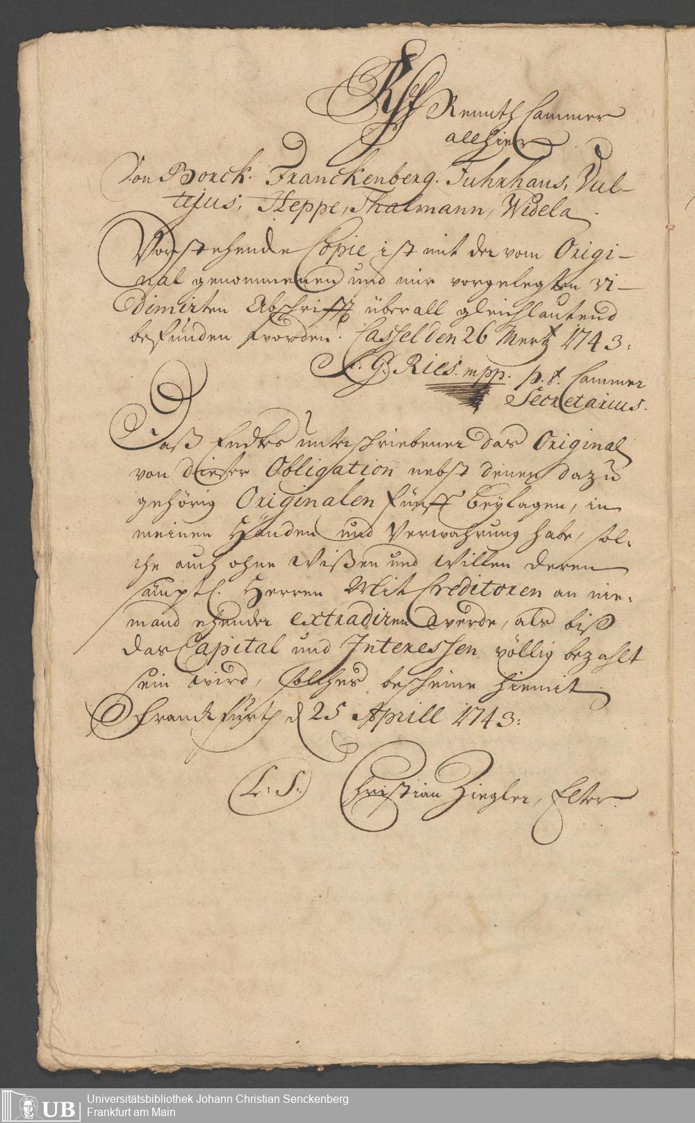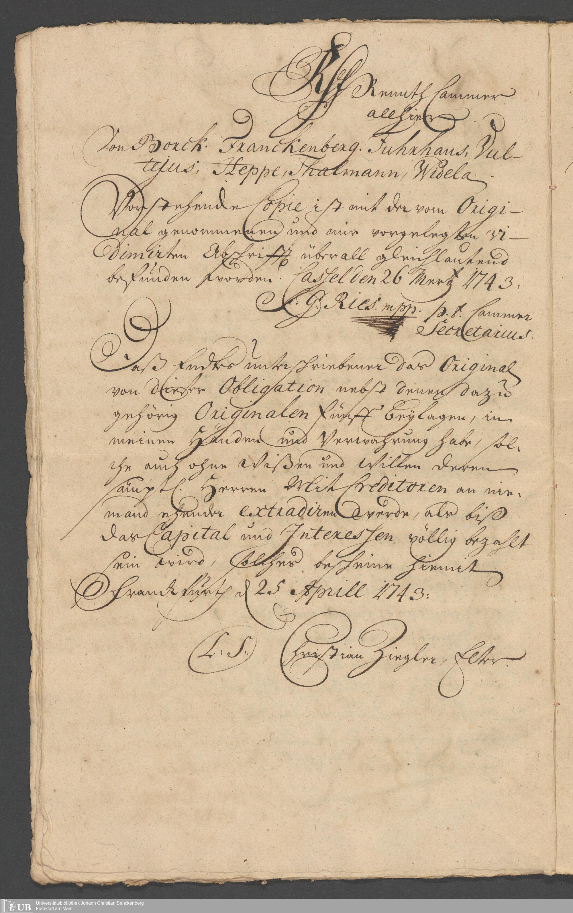 Na 31 Nachlass Johann Christian Senckenberg, 330 - Schuldbrief des Landgrafen Friedrich von Hessen