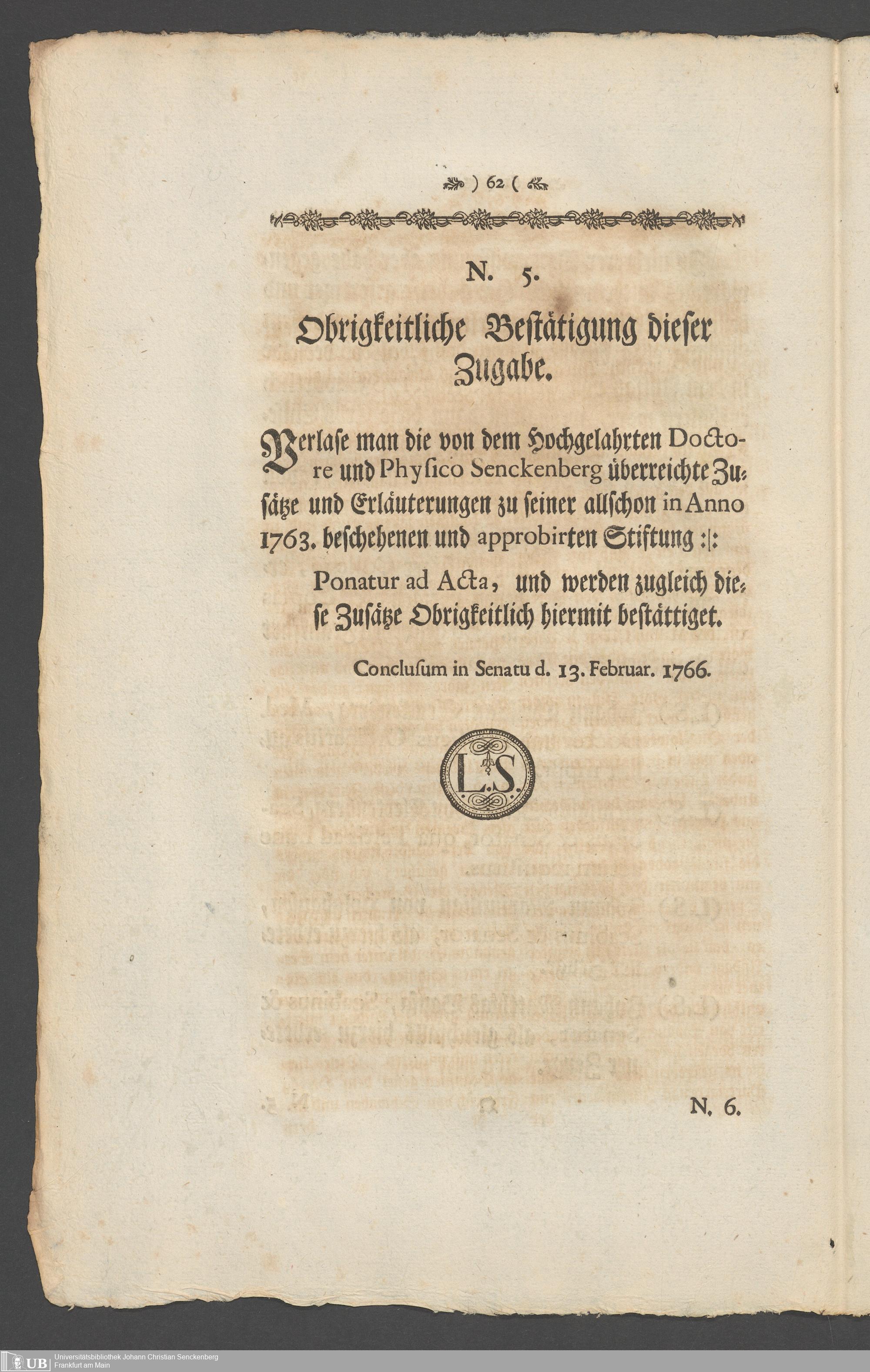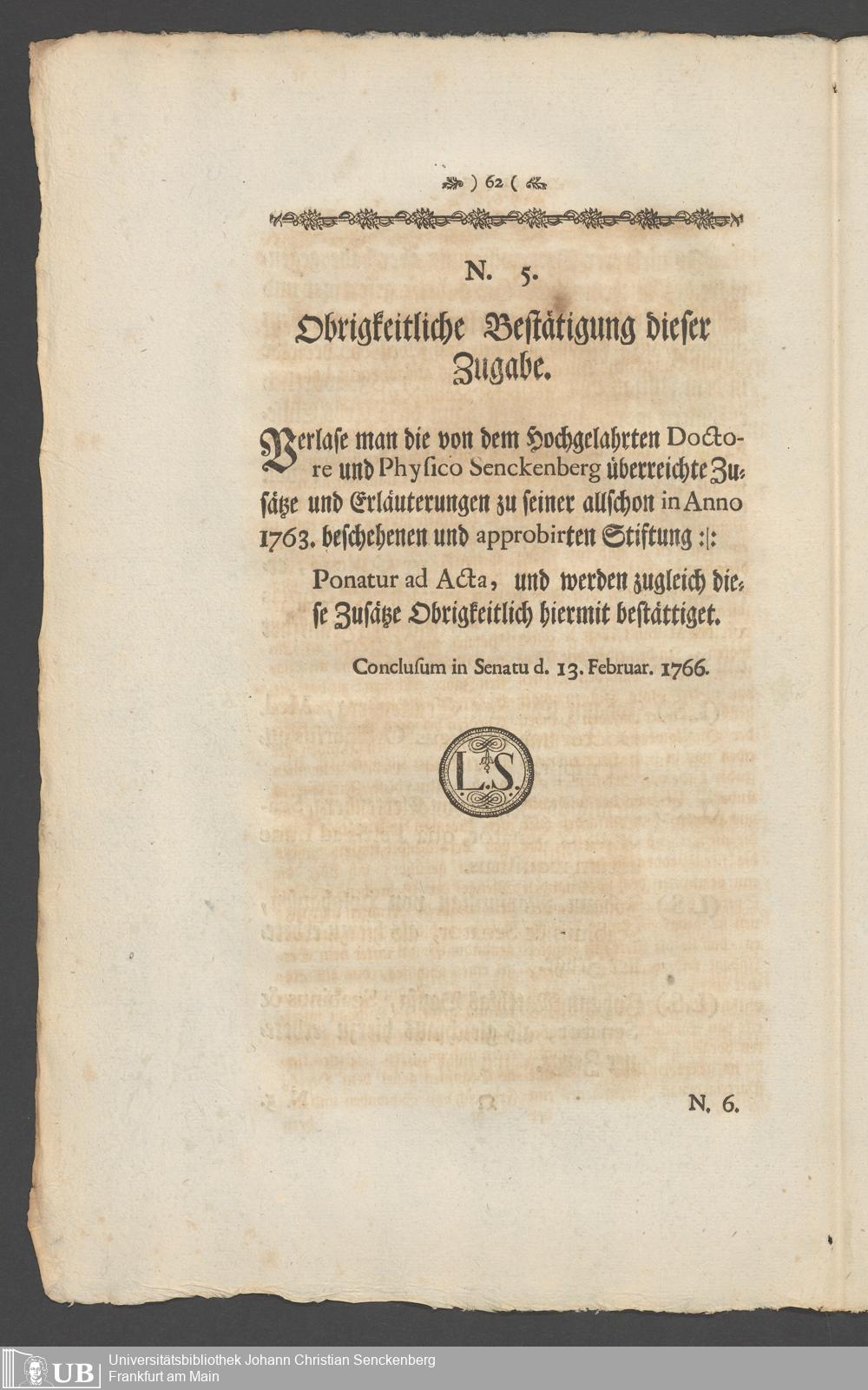 Na 31 Nachlass Johann Christian Senckenberg, 336 - Stiftungsbrief