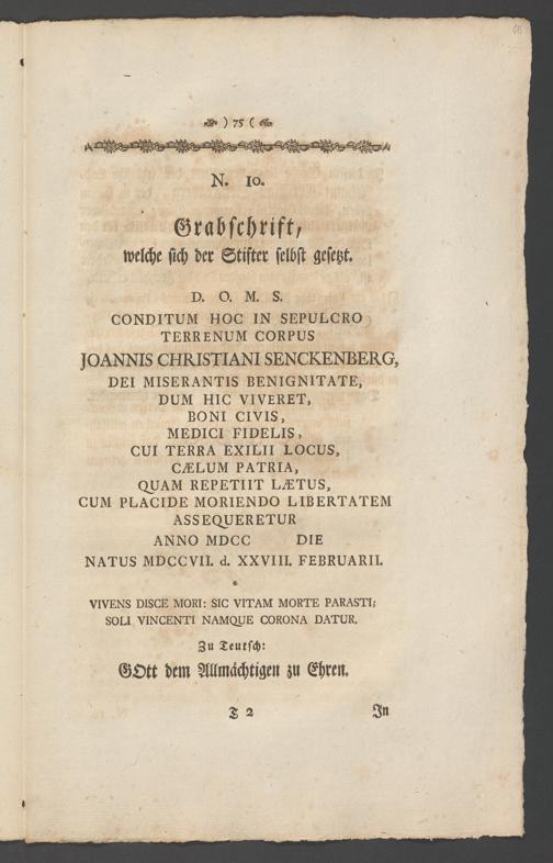 Stiftungs-Briefe zum Besten der Artzneykunst und Armenpflege ; samt Nachricht wegen eines zu unternehmenden Bürger- und Beysassen-Hospitals zum Behufe der Stadt Frankfurt ; nebst Vorbericht Renat Leopold Christian Carl Freyherrn von Senckenberg;