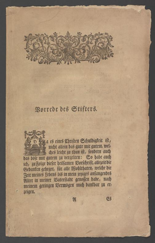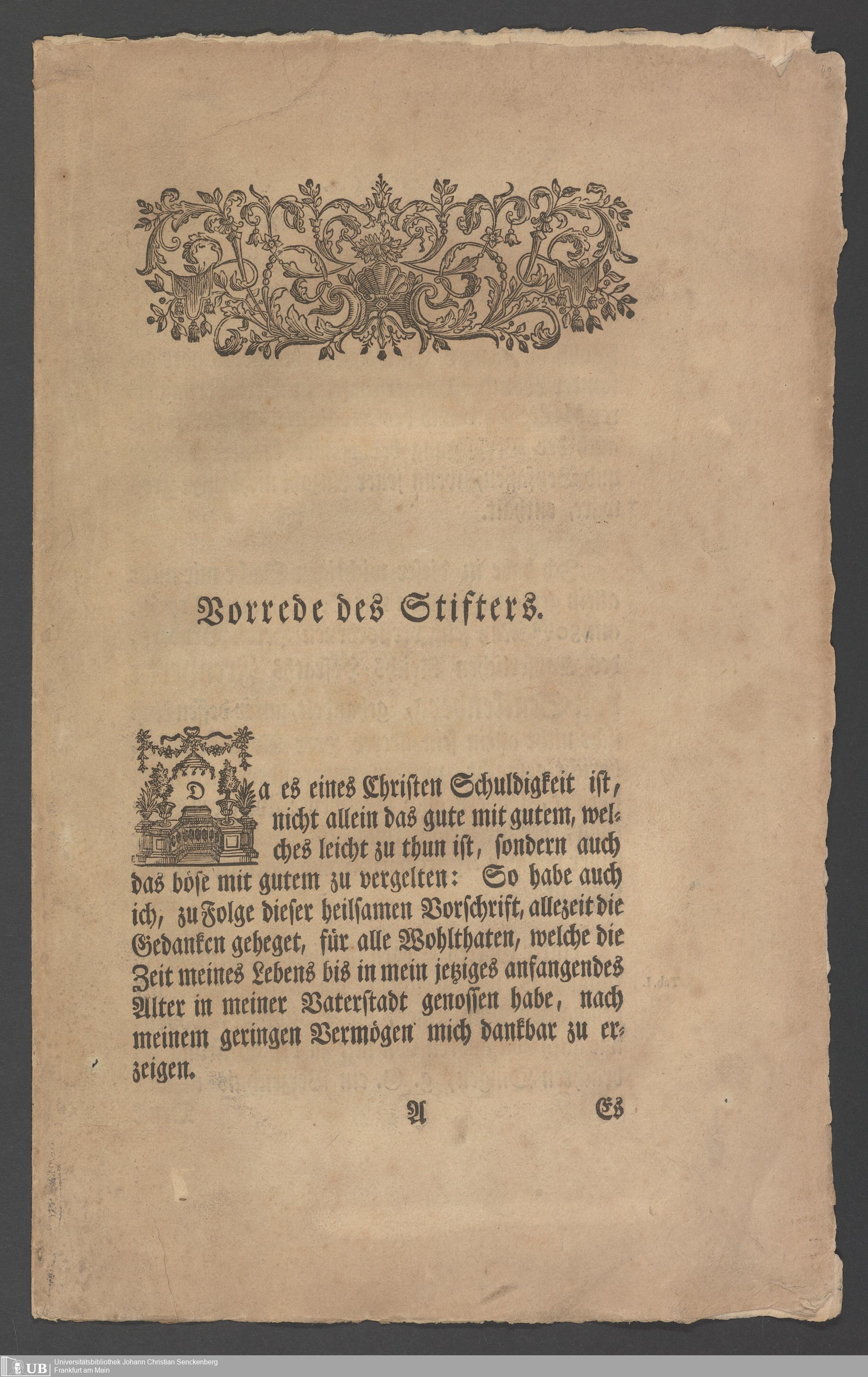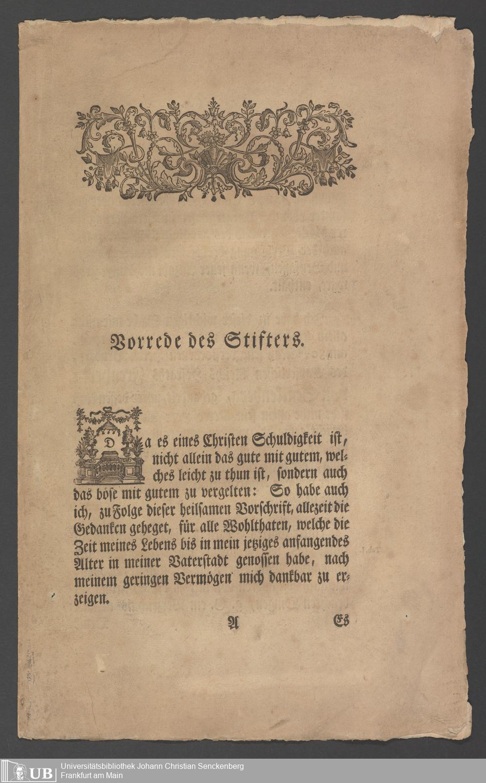 Stiftungs-Briefe zum Besten der Artzneykunst und Armenpflege ; samt Nachricht wegen eines zu unternehmenden Bürger- und Beysassen-Hospitals zum Behufe der Stadt Frankfurt ; nebst Vorbericht Renat Leopold Christian Carl Freyherrn von Senckenberg;