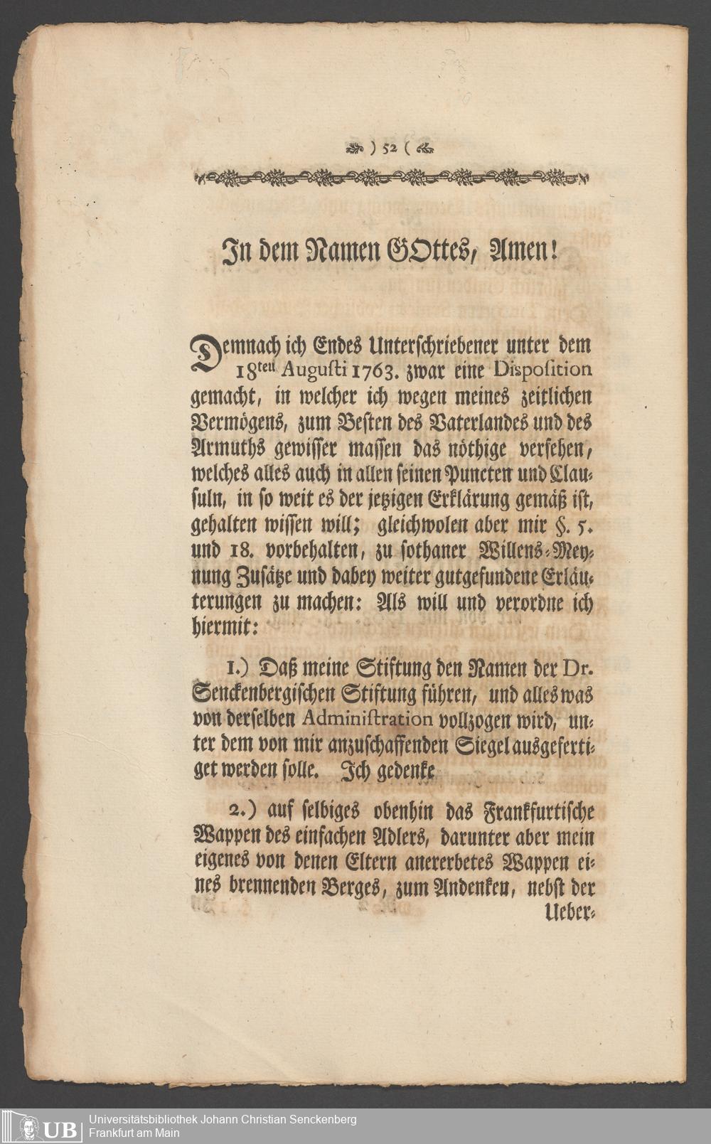 Na 31 Nachlass Johann Christian Senckenberg, 336 - Stiftungsbrief