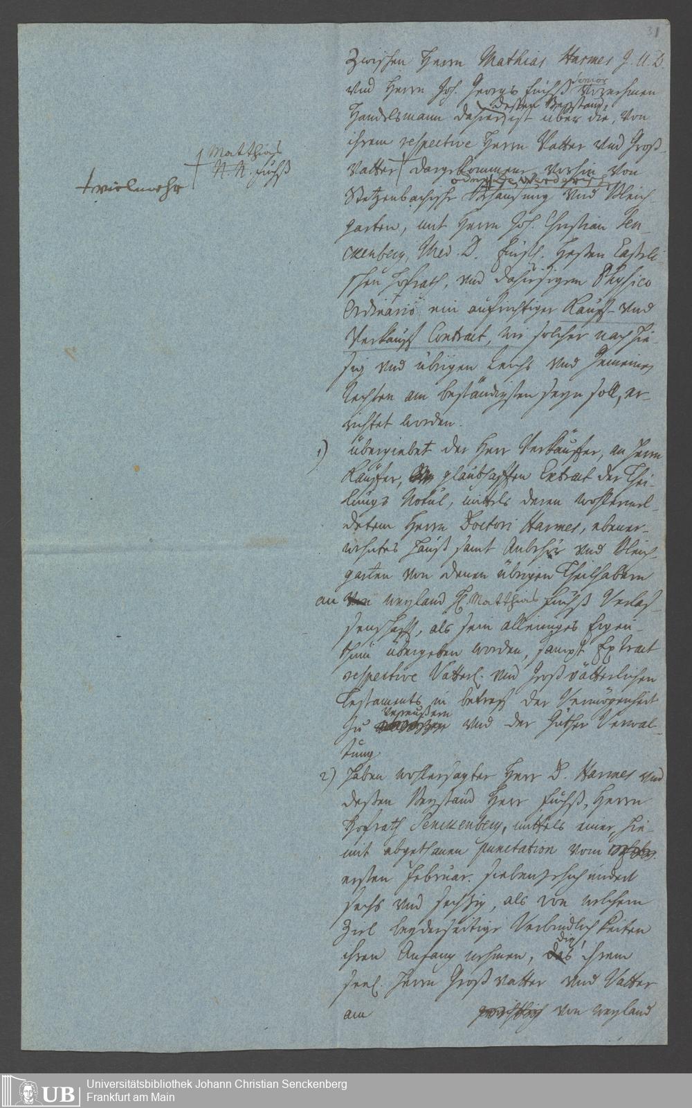 Na 31 Nachlass Johann Christian Senckenberg, 337 - Verträge über den Kauf des de-Werderschen Hauses