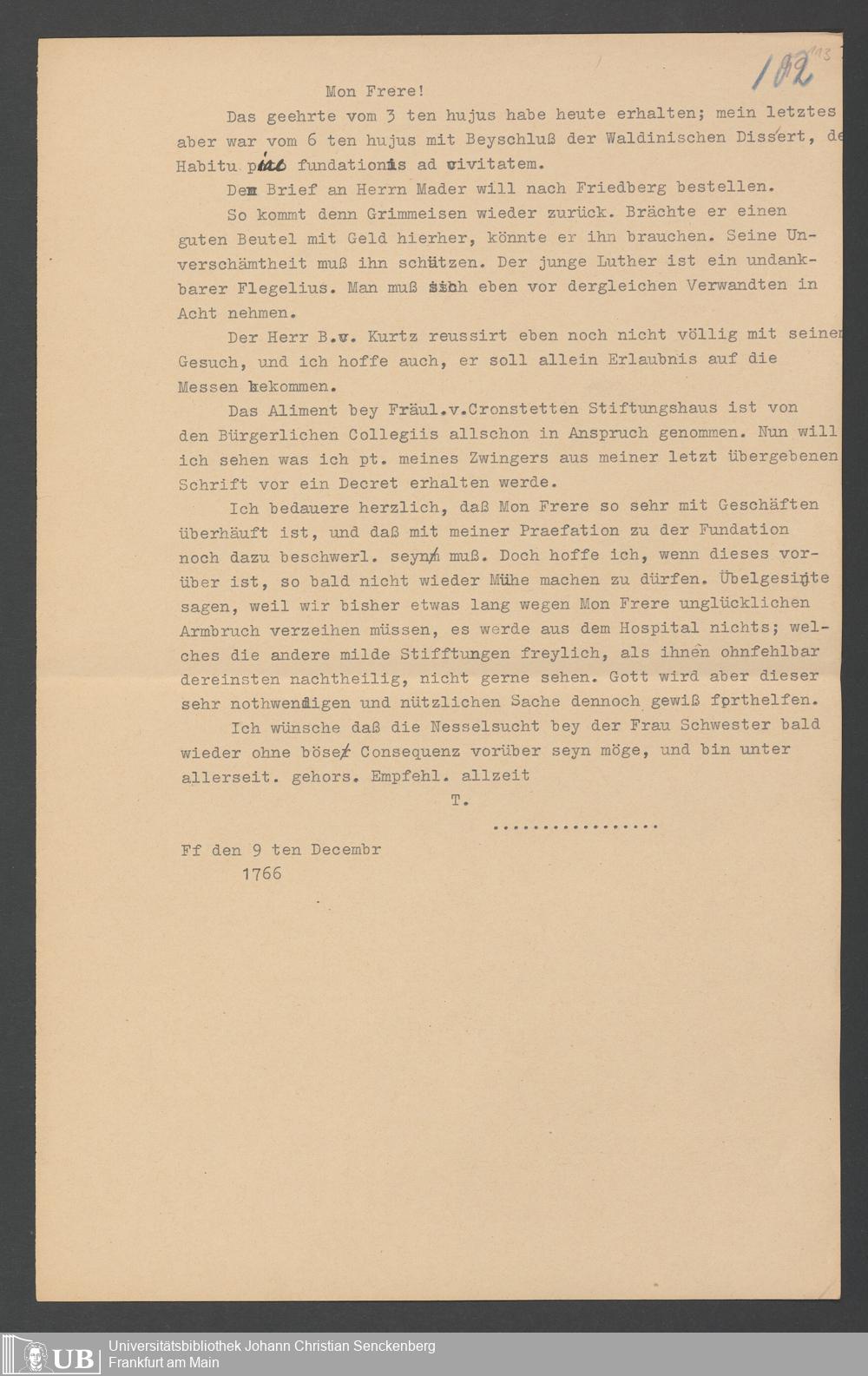 Na 31 Nachlass Johann Christian Senckenberg, 357 - Briefe Heinrich Christian Senckenbergs