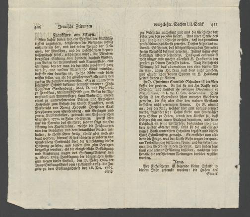Na 31 Nachlass Johann Christian Senckenberg, 362 - Pressebesprechungen und private Anerkennungsschreiben über die Stiftung
