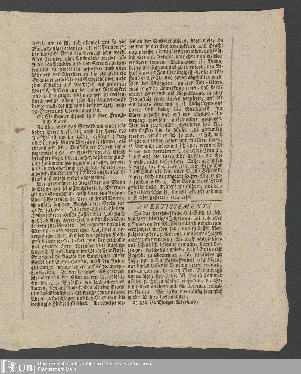Na 31 Nachlass Johann Christian Senckenberg, 362 - Pressebesprechungen und private Anerkennungsschreiben über die Stiftung