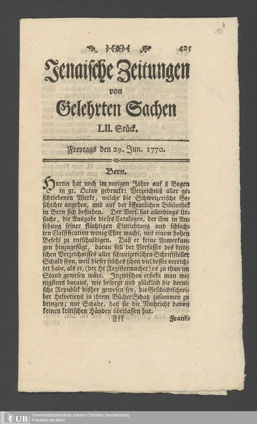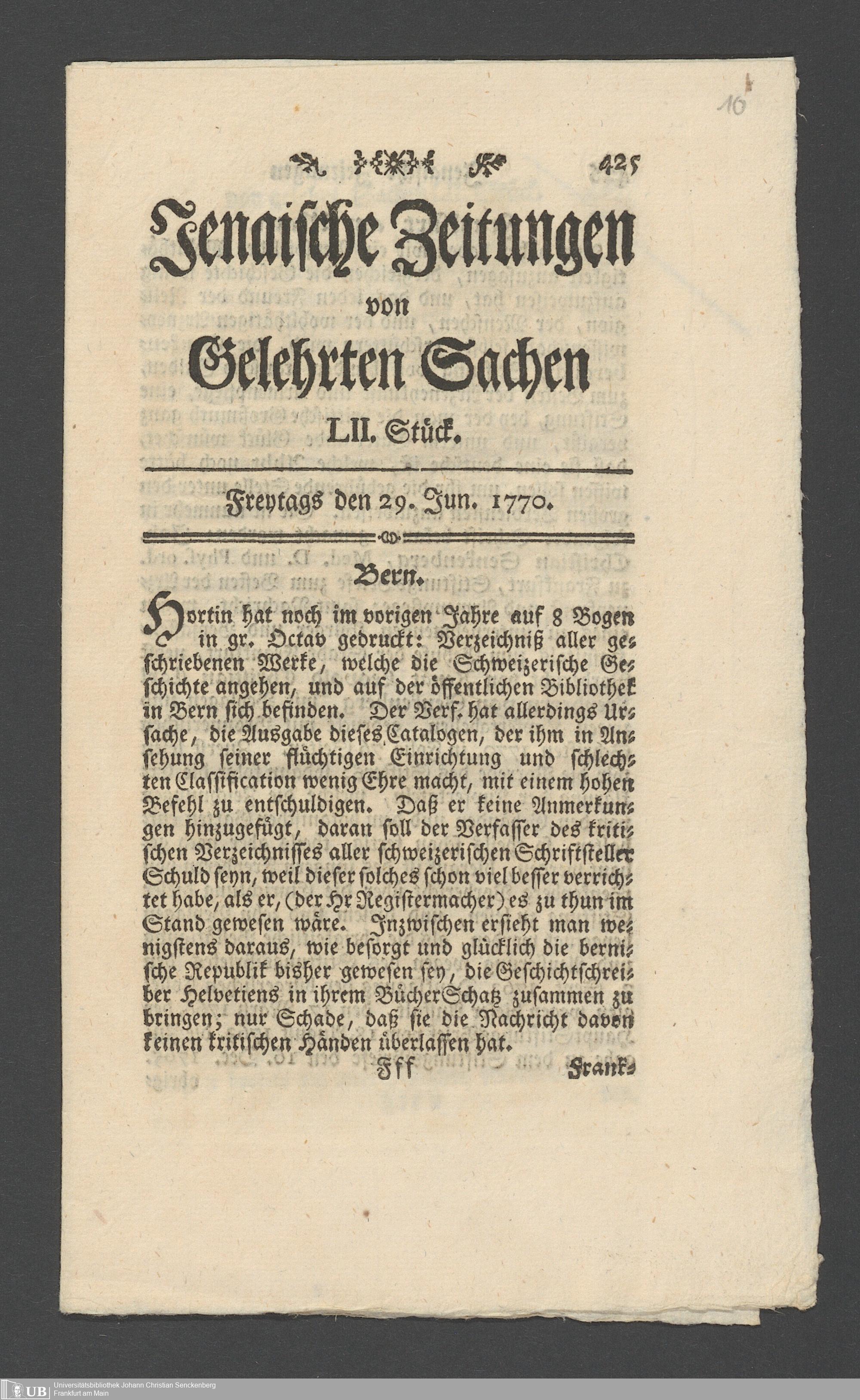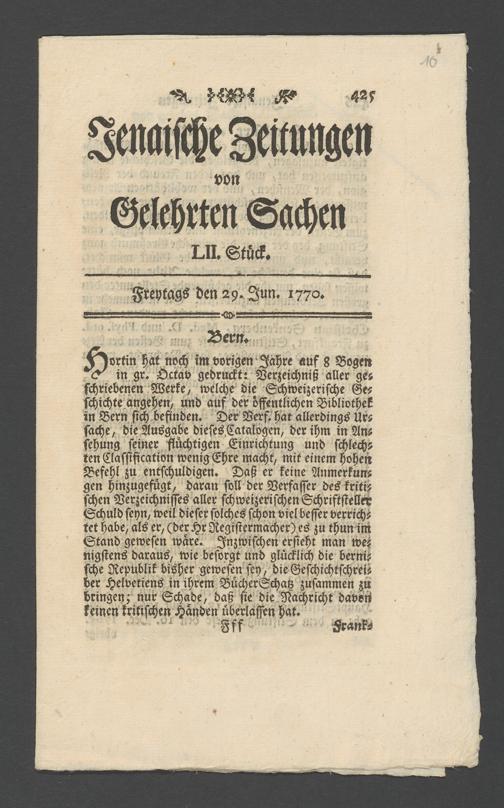 Na 31 Nachlass Johann Christian Senckenberg, 362 - Pressebesprechungen und private Anerkennungsschreiben über die Stiftung