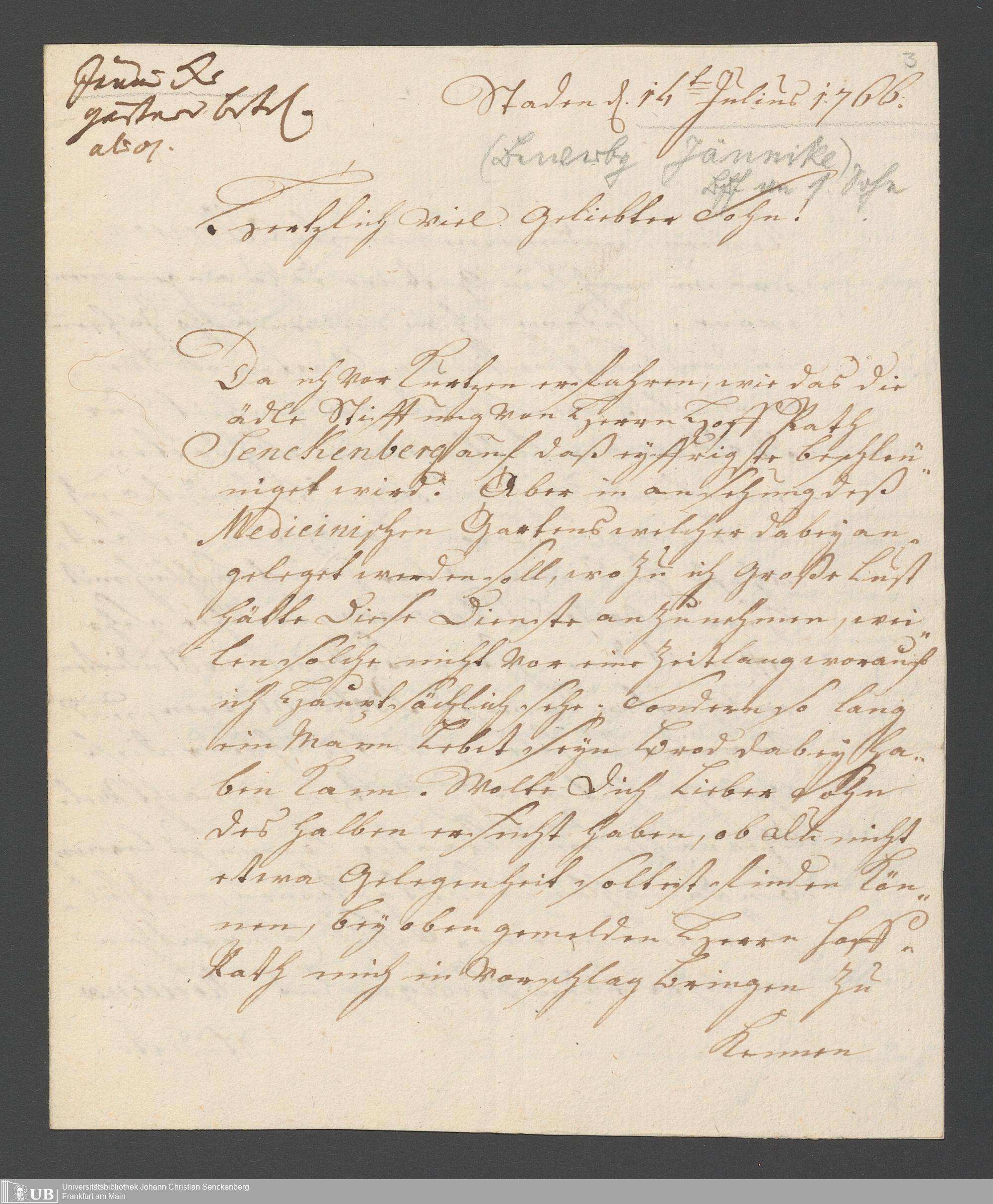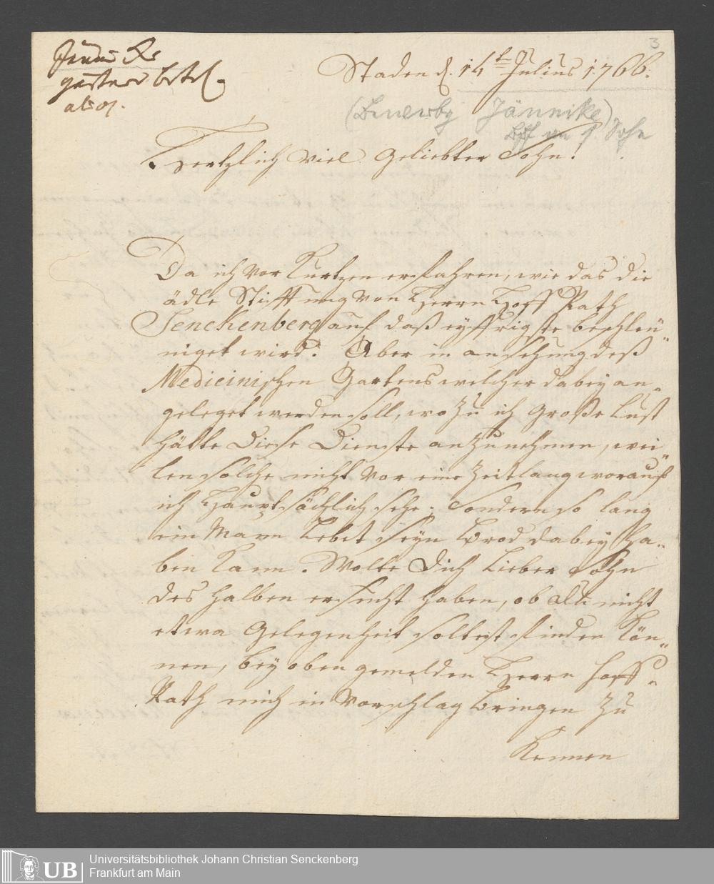 Na 31 Nachlass Johann Christian Senckenberg, 368 - Anstellung eines Gärtners für den Botanischen Garten