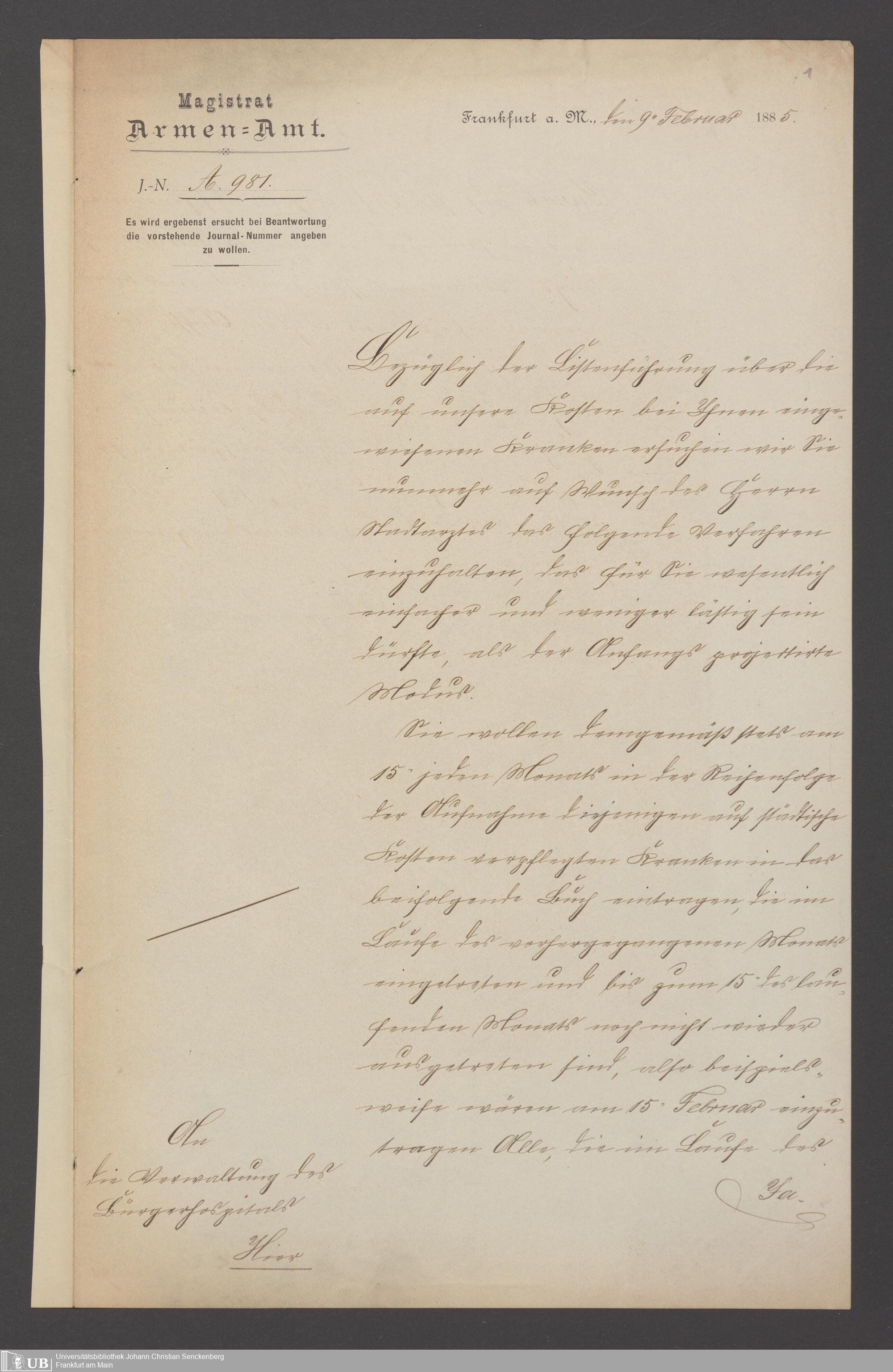 B 5 Dr. Senckenbergische Stiftung, 22 - Schriftwechsel zwischen der Verwaltung des Bürgerhospitals und dem Armenamt der Stadt Frankfurt