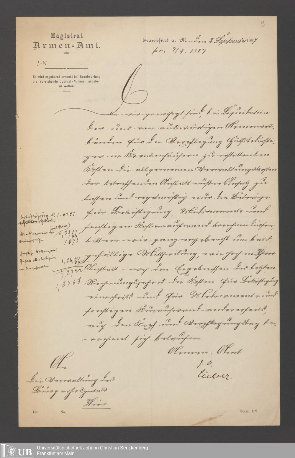 B 5 Dr. Senckenbergische Stiftung, 22 - Schriftwechsel zwischen der Verwaltung des Bürgerhospitals und dem Armenamt der Stadt Frankfurt
